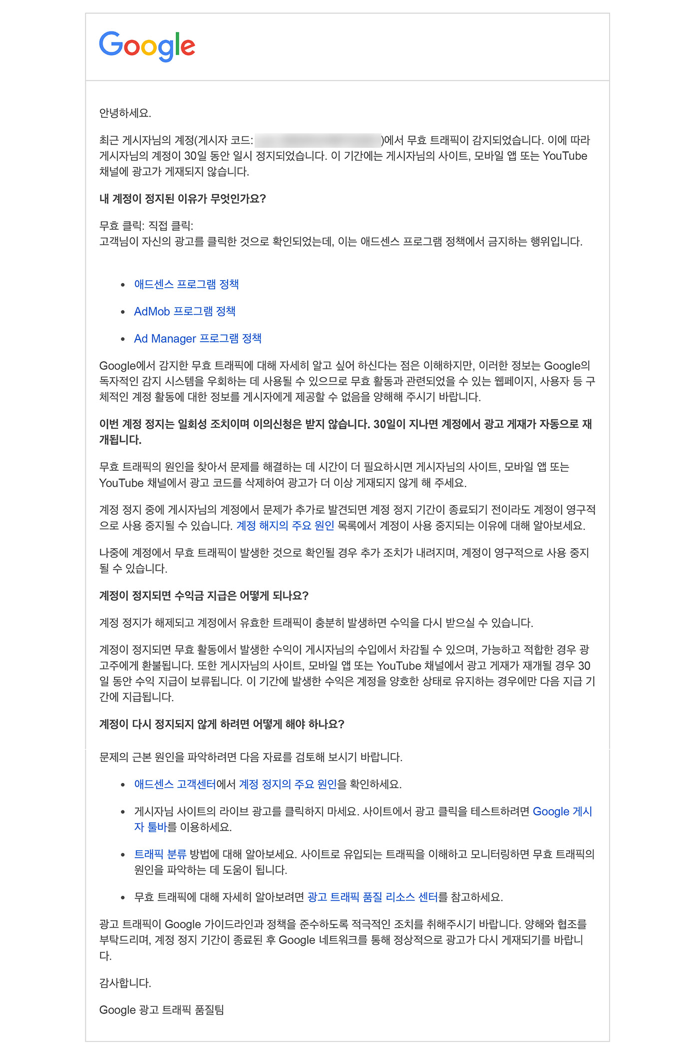 일단 무효클릭에 대한 정지처분에 대한 이의신청은 받아들여지지 않고 30일간의 계정정지가 된다.