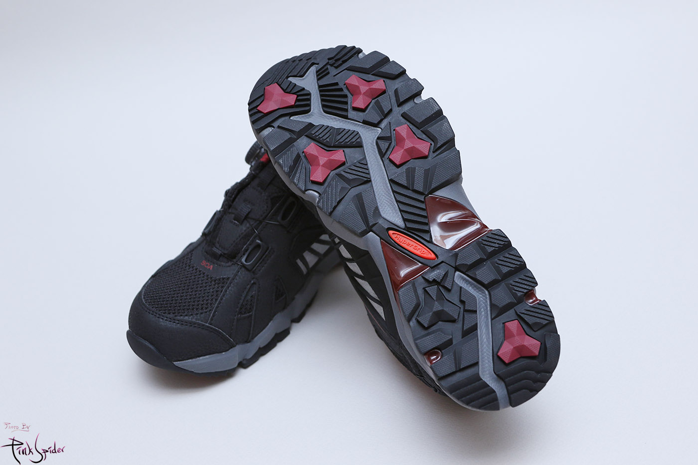 미드솔부터 아웃솔까지 3가지의 재질(고무/EVA/TPU)로 경도를 달리하여 접지 상황에 따라서