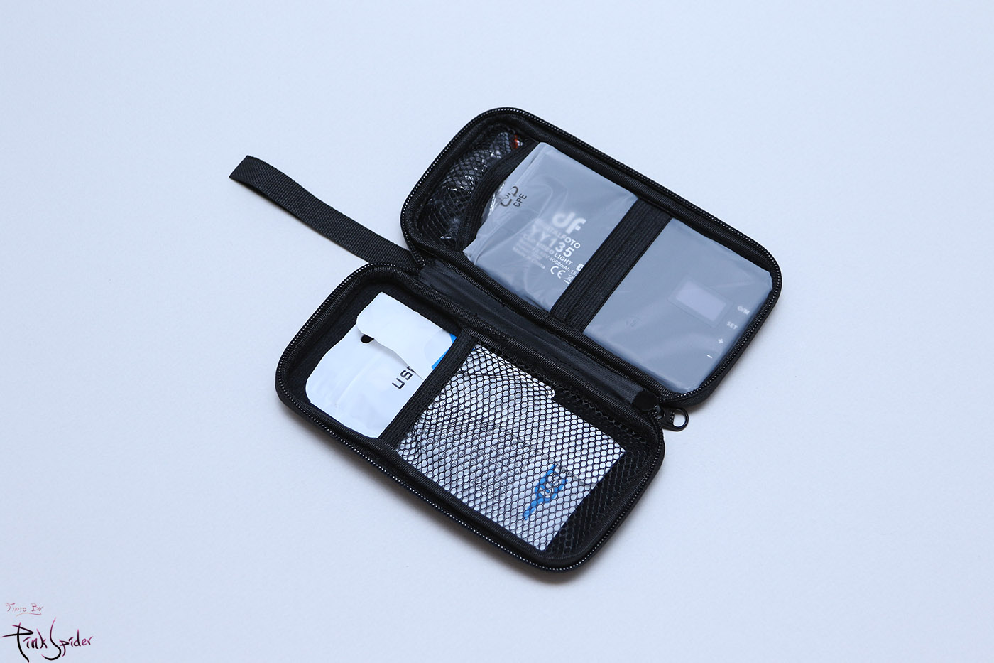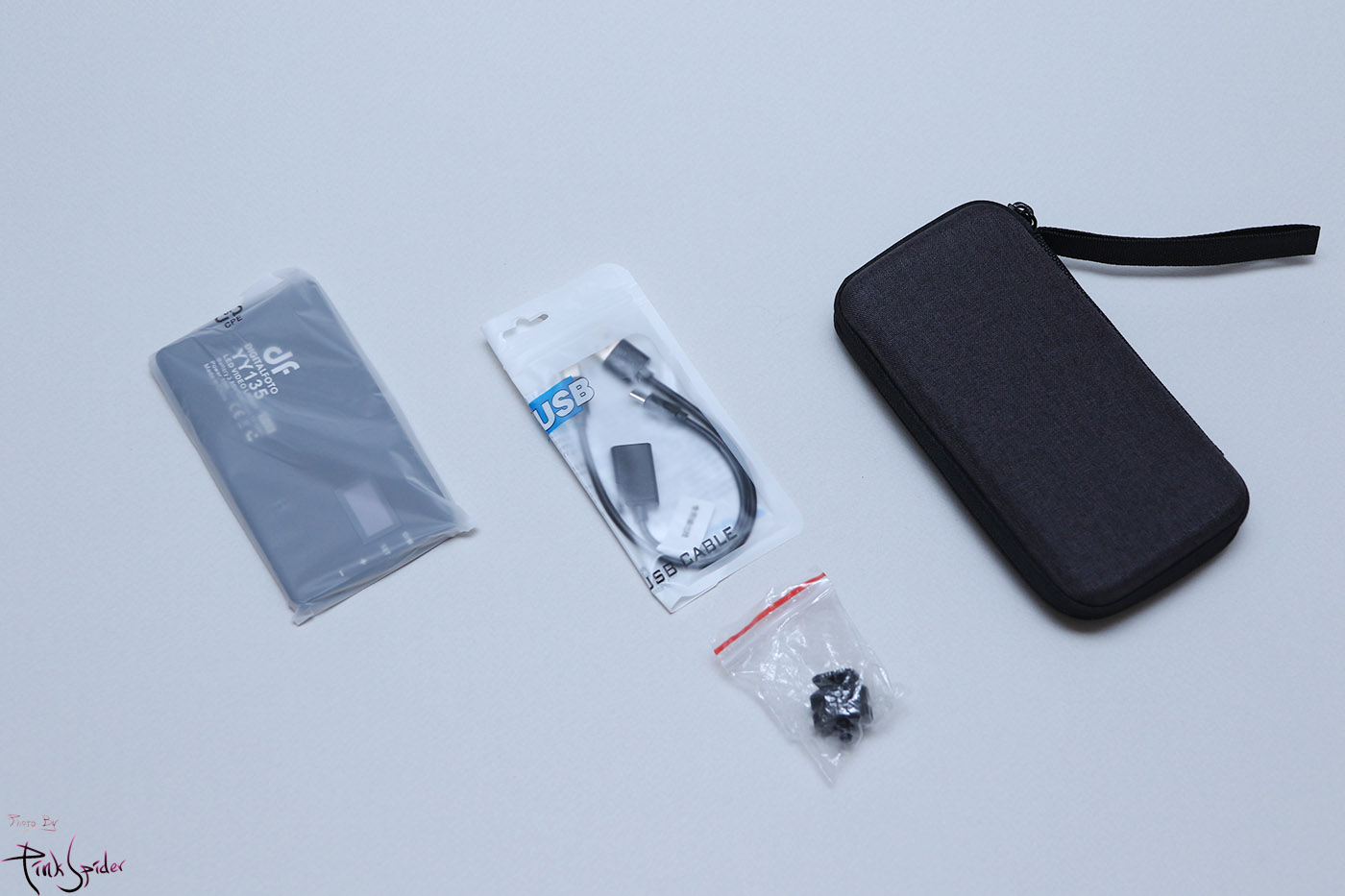 제품 구성은 본체, C타입 충전케이블, 보조배터리로 사용할 수 있는 USB 케이블, 핫슈 마운트 그리고 케이스