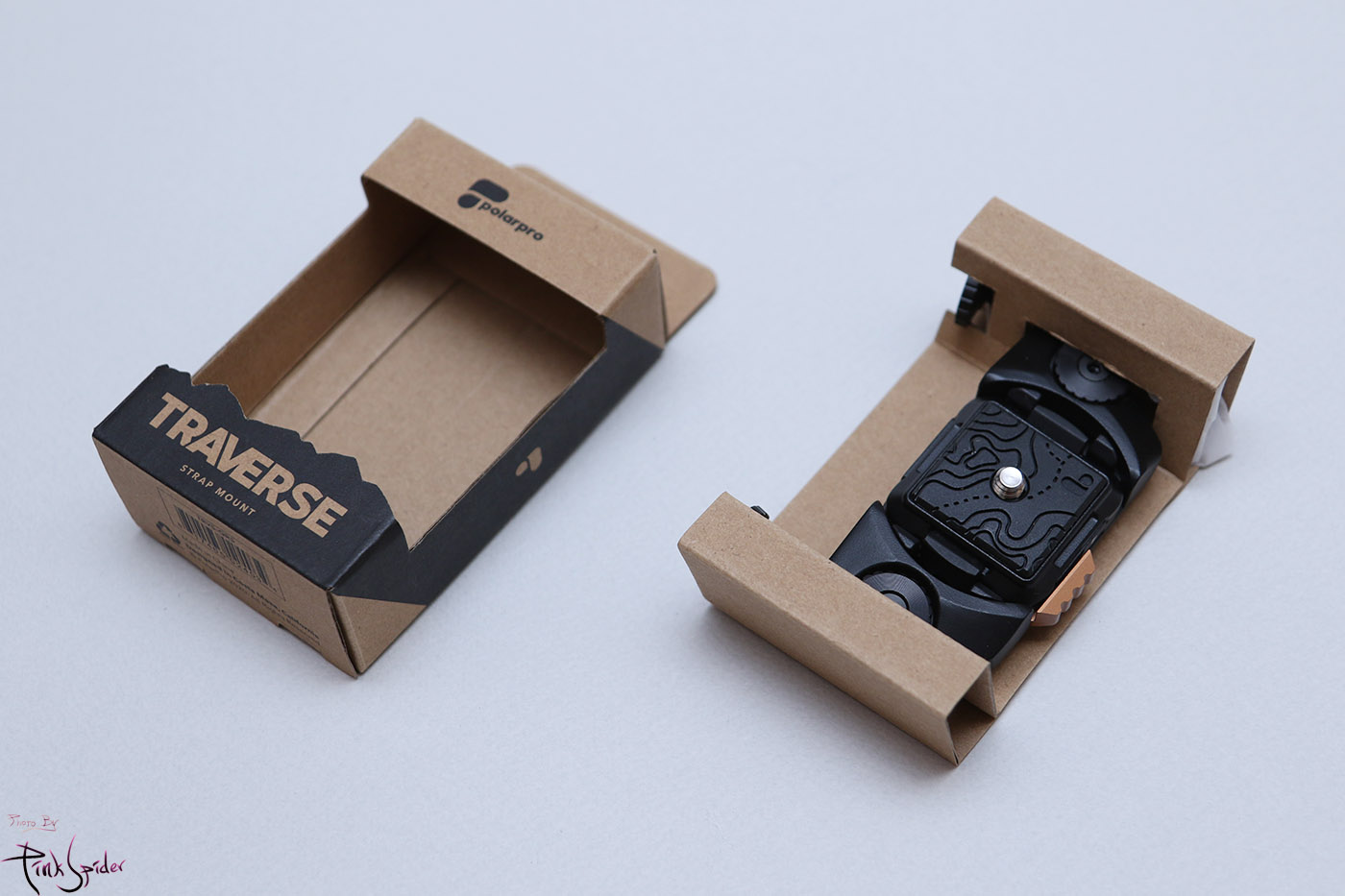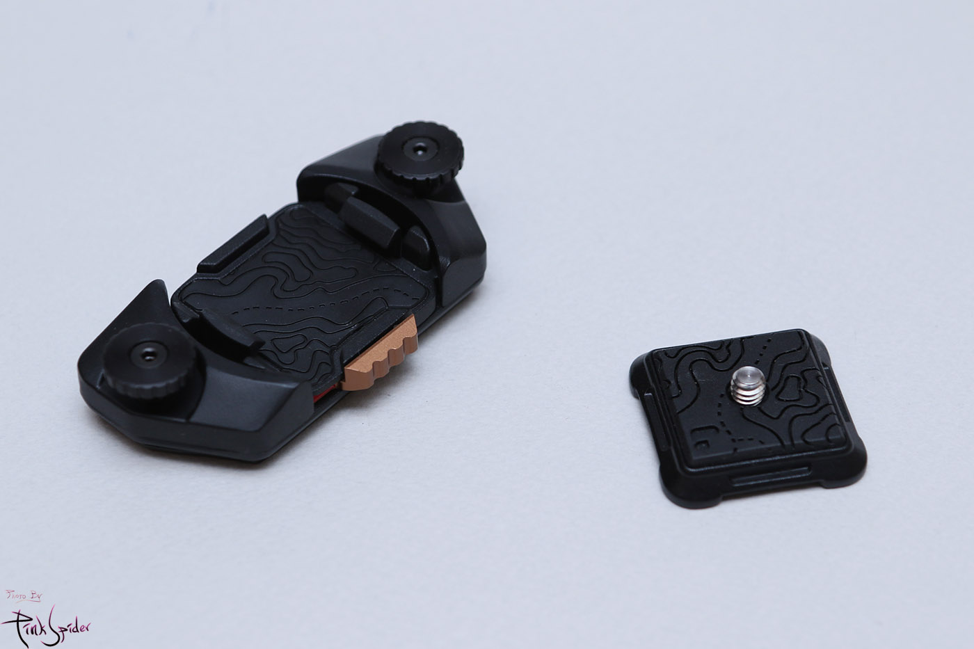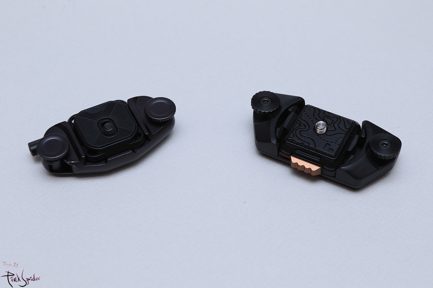 왼쪽이 픽디자인 V3 카메라 클립, 오른쪽이 폴라프로 트래버스 스트랩 마운트