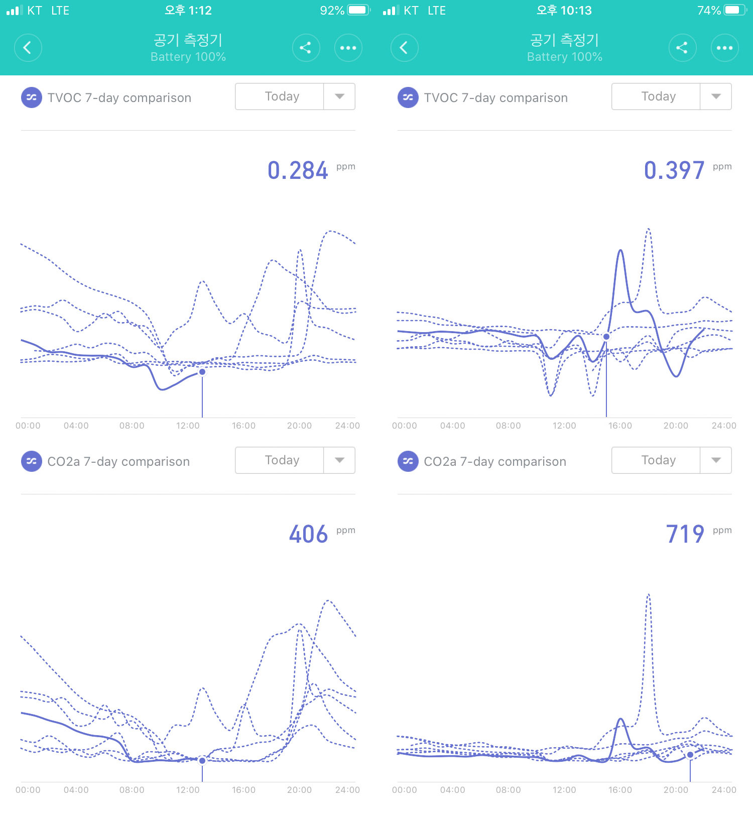 비슷한 시간에 환기를 시키고 미에어를 사용할 때 신형의 경우 TVOC 수치가 올라가는 정도가 다소 느린 편이긴한데...