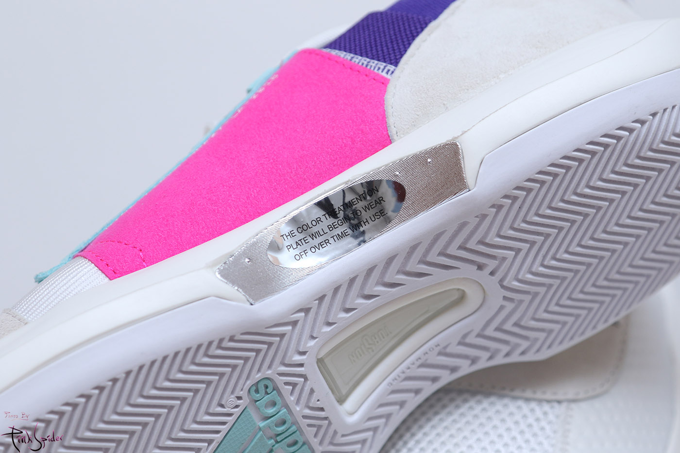 아웃솔 중간 부분에는 살짝 메탈느낌의 컬러파츠가 있는데 스크레치 방지용으로 스티커가 붙어 있어서 사용 시에는 떼어내야 함