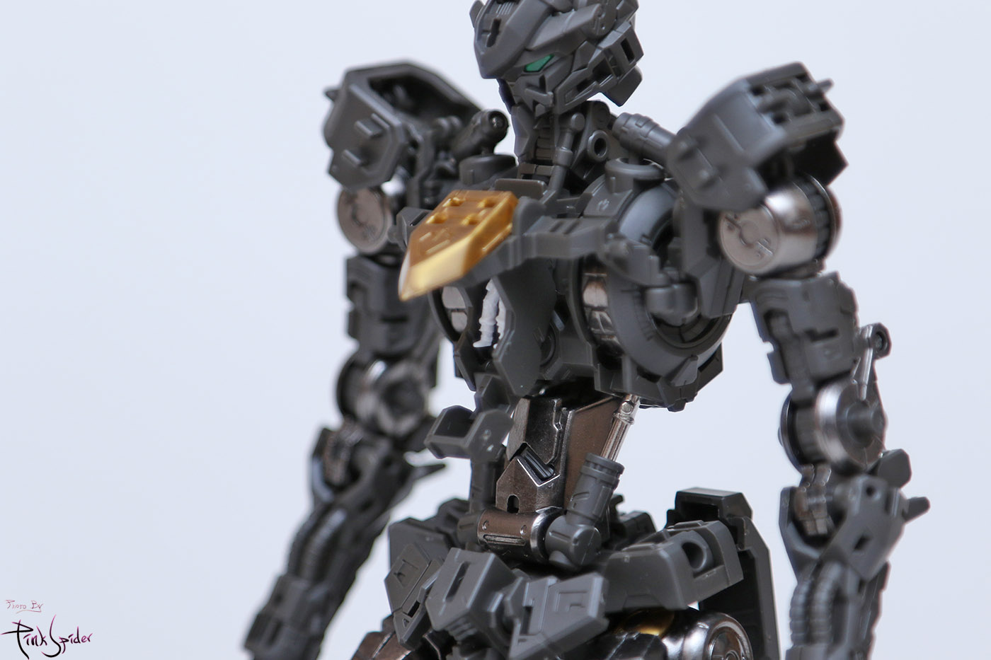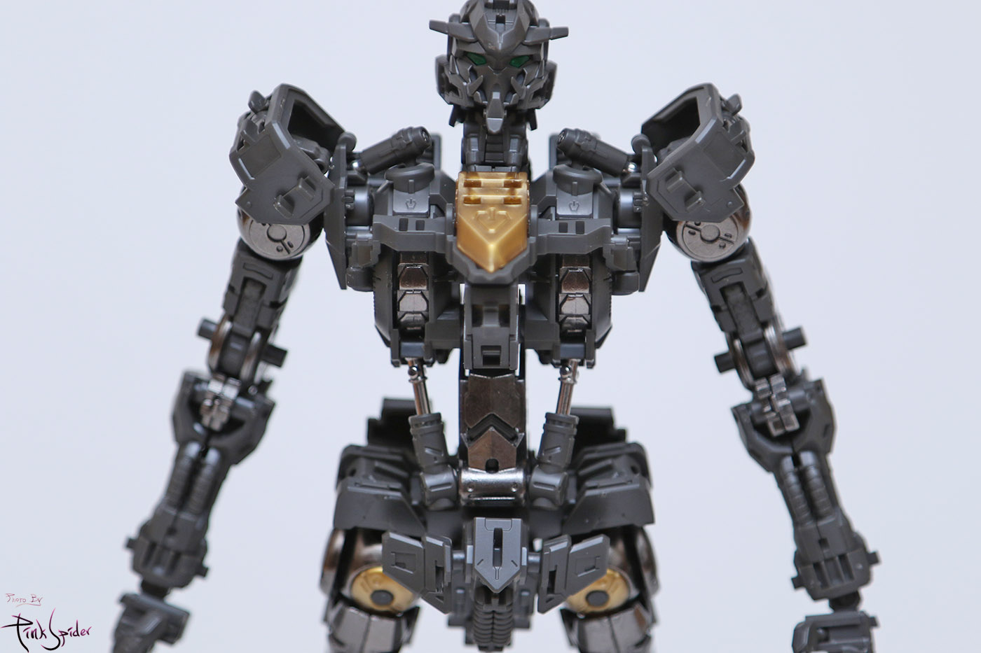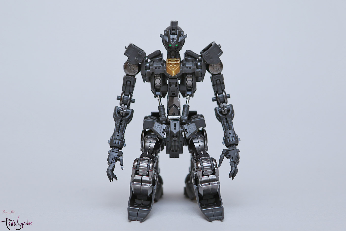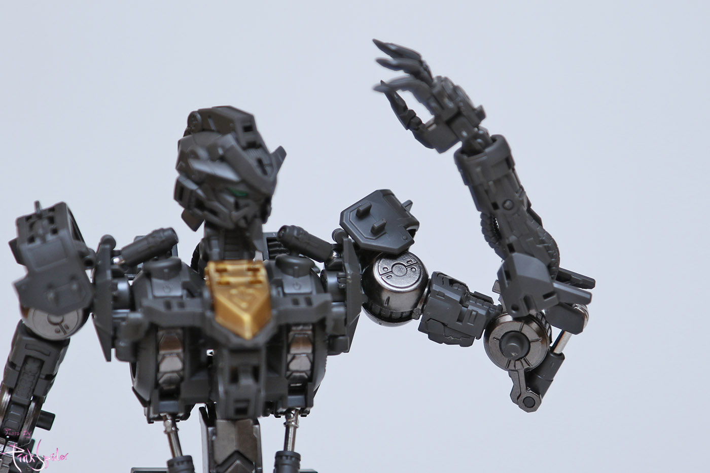 전면에는 제너레이터 링파츠와 허리로 이어지는 프레임 그리고 흉부 앞 실린더가 메탈 파츠이고