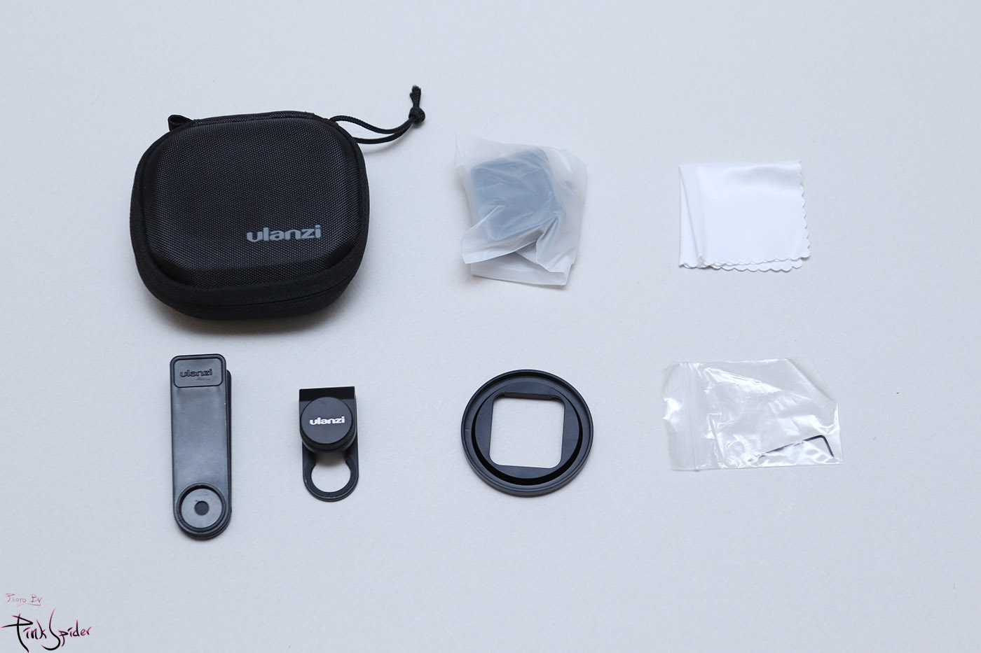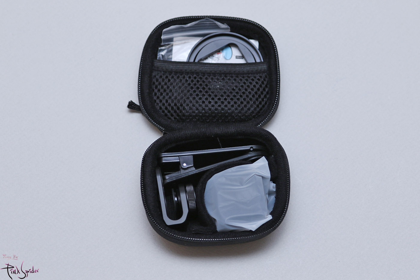 제품 구성은 전용케이스, 렌즈 연결용 클립 2종류, 필터 어댑터, 어댑터 고정용 렌치 그리고 렌즈가 들어 있다.