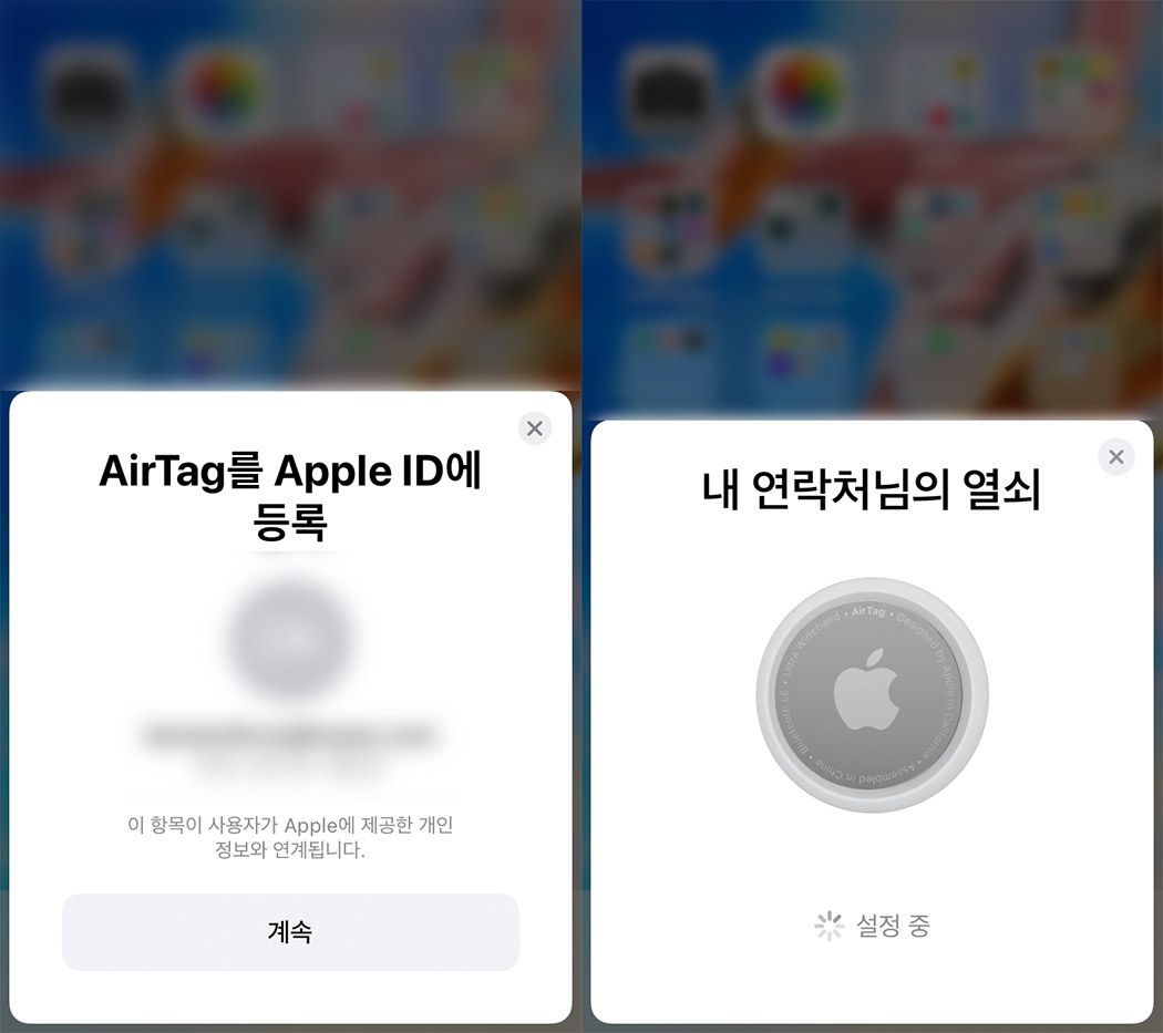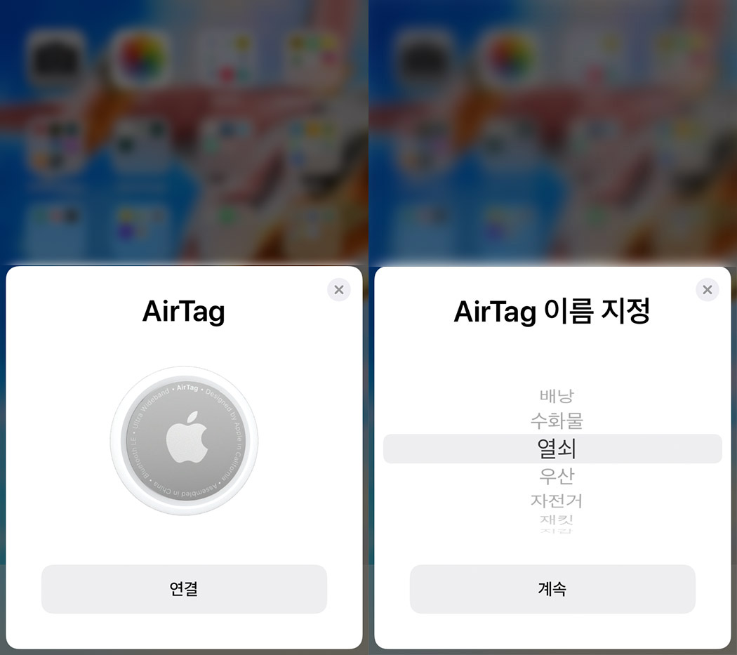 에어태그에 커버용지를 떼어내면 자동으로 연결을 시도한다.