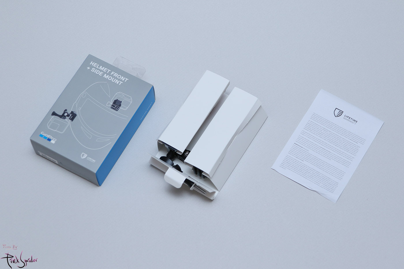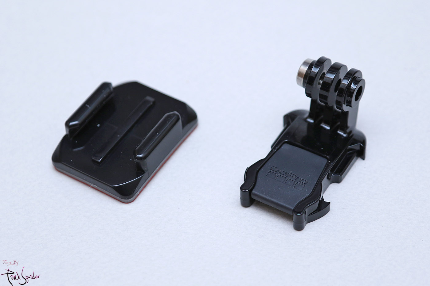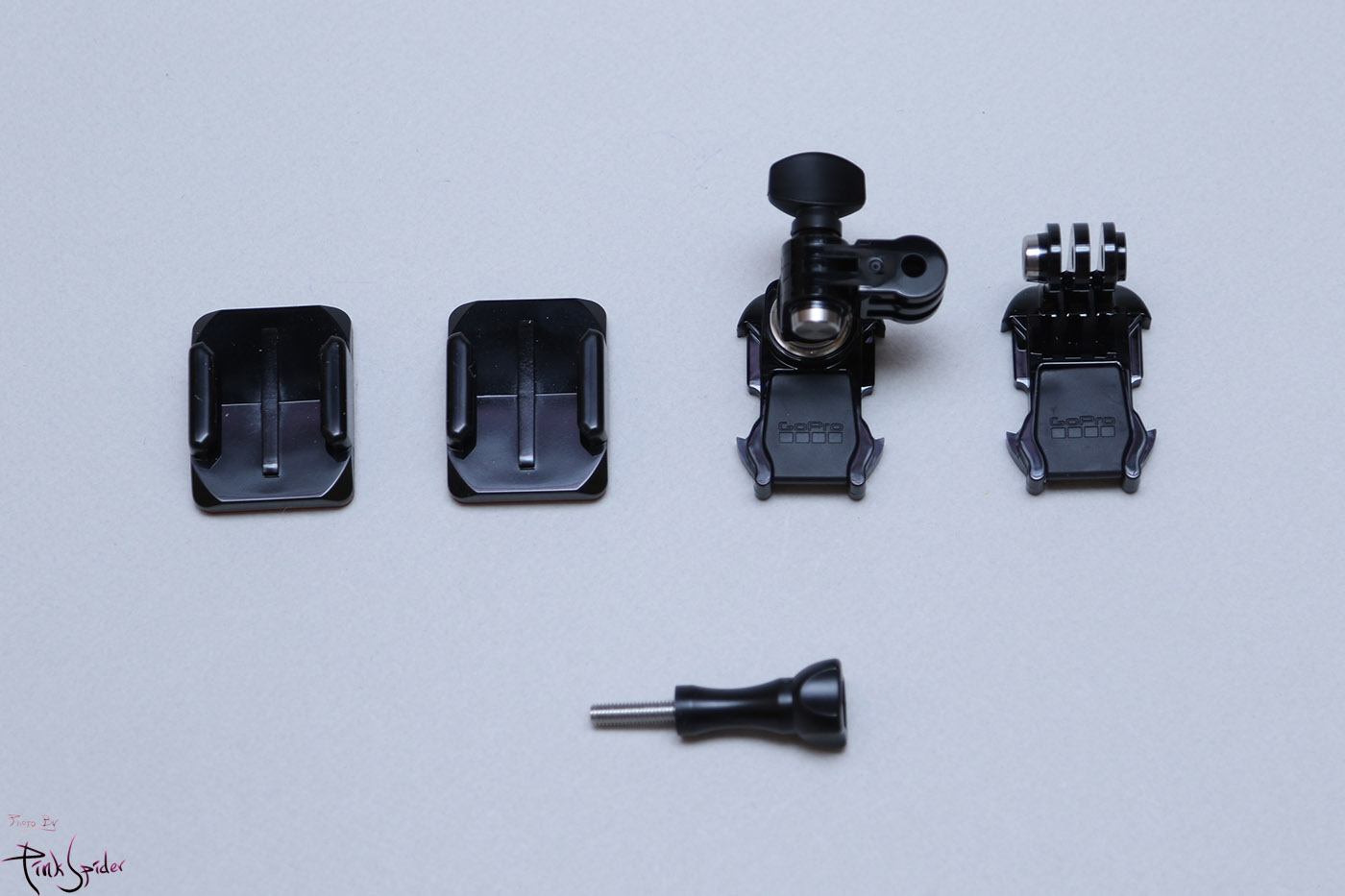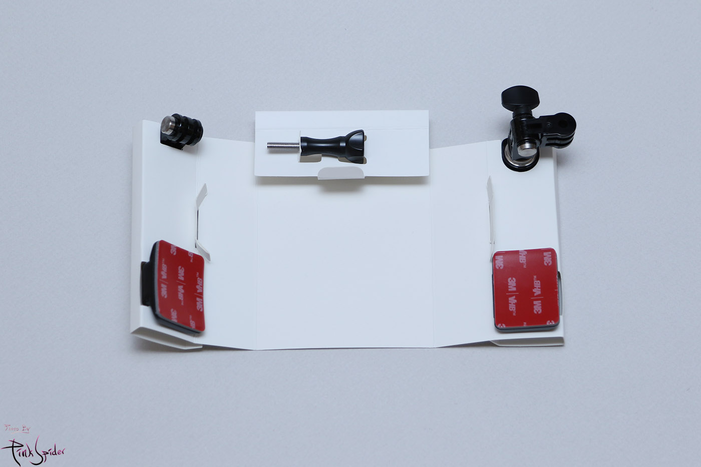 헬멧에 사용할 제품이다보니 곡면 부착 마운트 2개와 수직 버클 2개 그리고 긴 나비나사가 들어 있다.