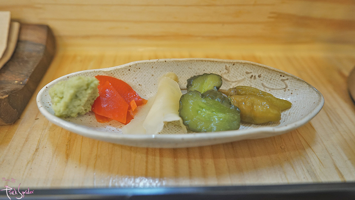 연어, 참돔, 방어, 전복, 붕장어, 오이에 올린 성게알과 연어알 그리고 아마 전갱이(아닐까 싶다)