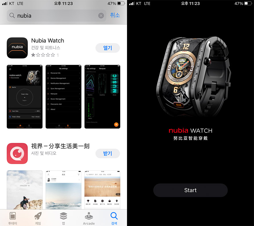 앱스토어에서 'Nubia Watch'를 검색해서 다운받고 바로 실행하면