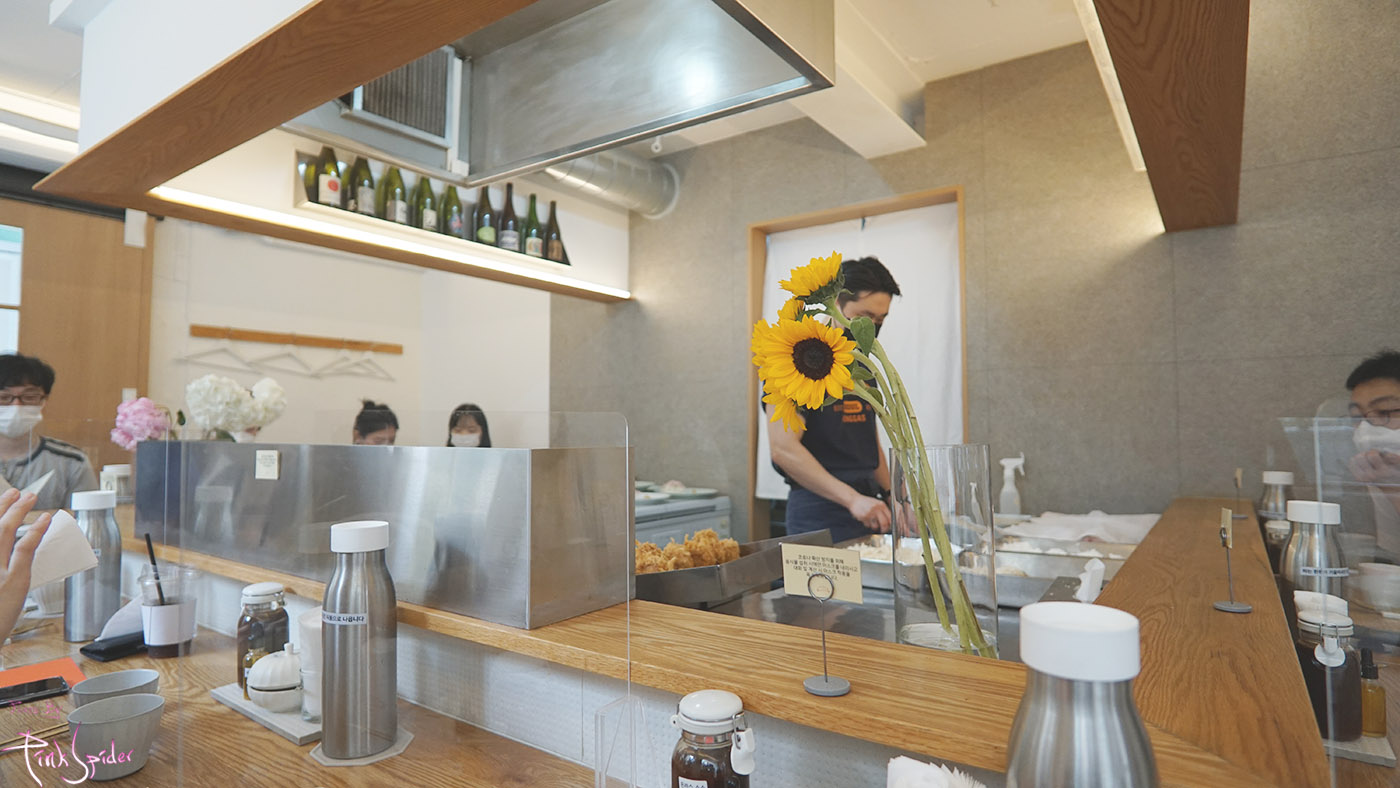 매장 안 인테리어는 심플하면서도 깔끔하고 오픈 키친 타입이라서 돈까스가 조리되는 과정을 볼 수 있어서 보는 재미도 있다.