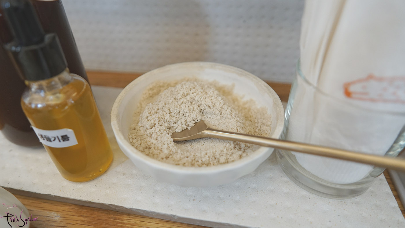 이렇게 접시 위에 소금을 올리고 생들기름을 스포이드로 살짝 올려주고 섞어 먹으면 되는데