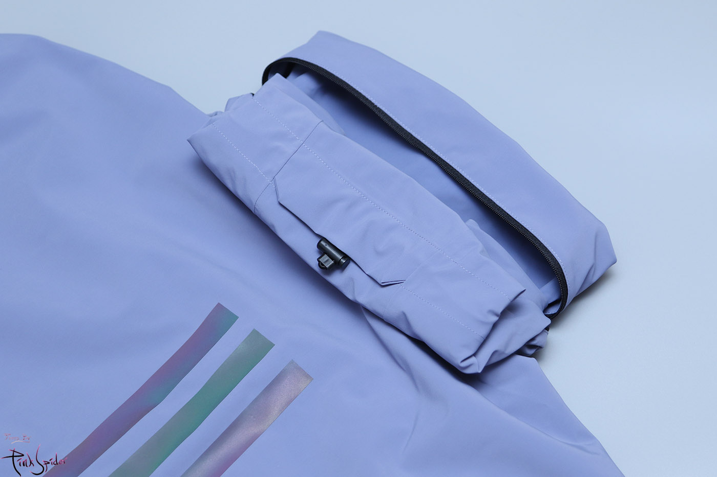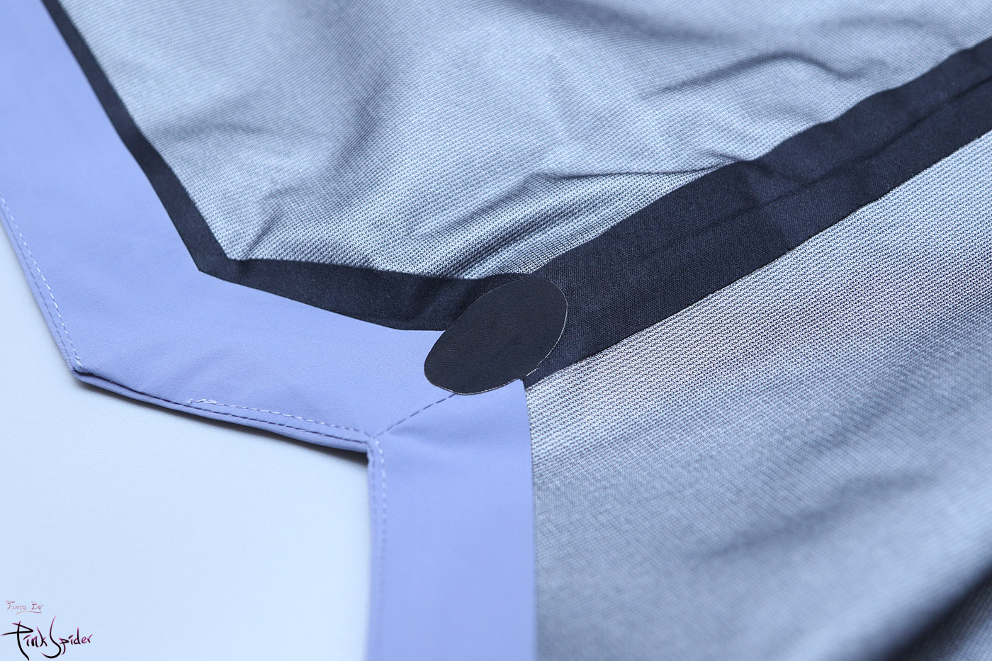 소매 바깐쪽의 원단을 더 길게 해놔서 비를 맞을 때에도 안쪽으로 스며들지 않고 자연스럽게 떨어질 수 있도록
