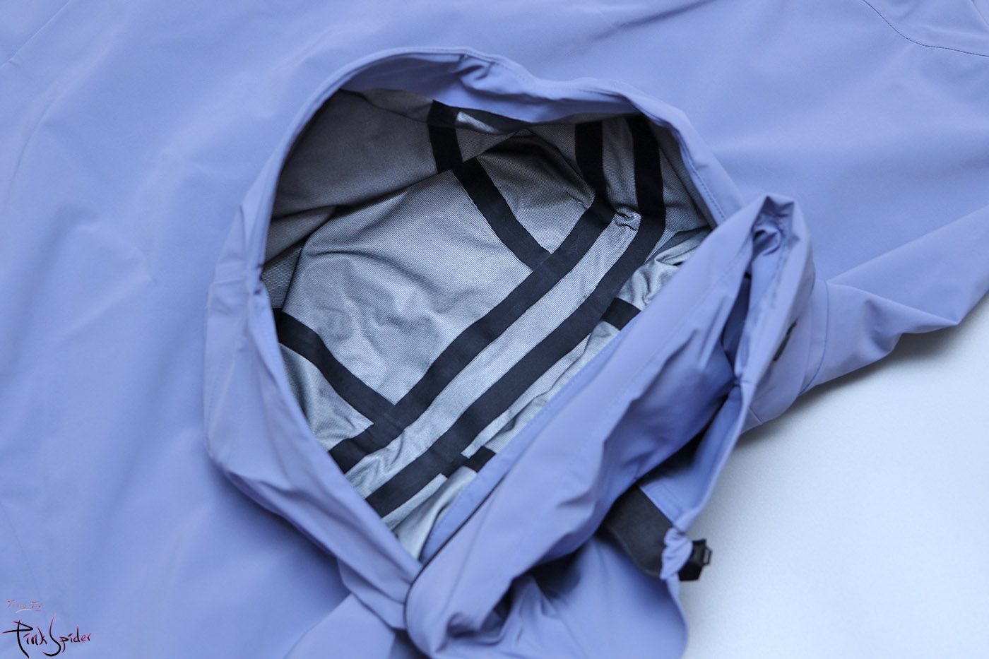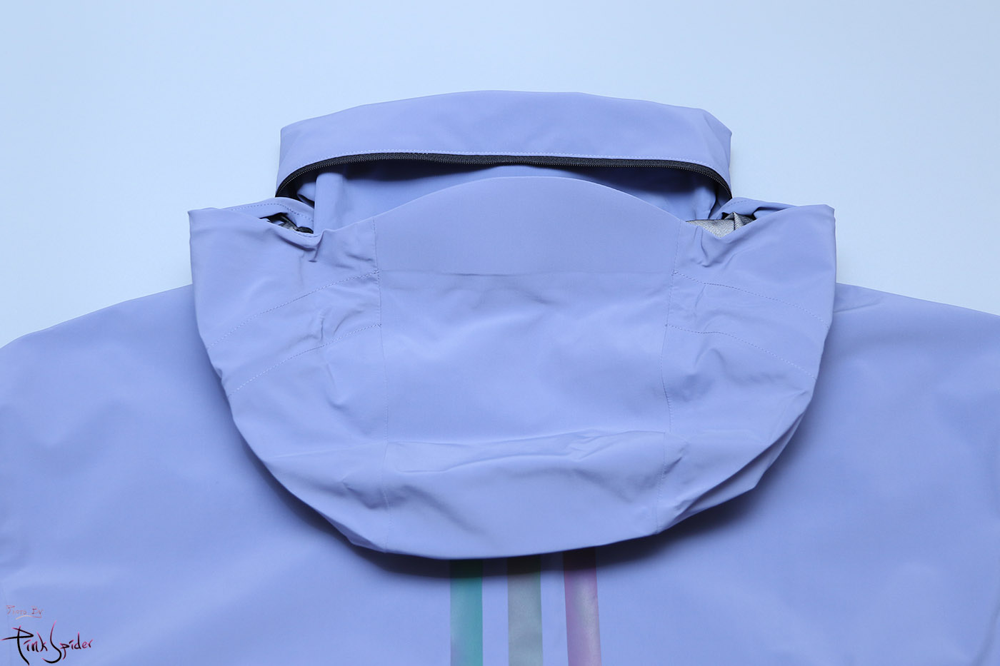 넥라인에는 당연히 후드가 들어 있는데 앞쪽 지퍼처럼 고무코팅이 되어 있는 건 아니지만