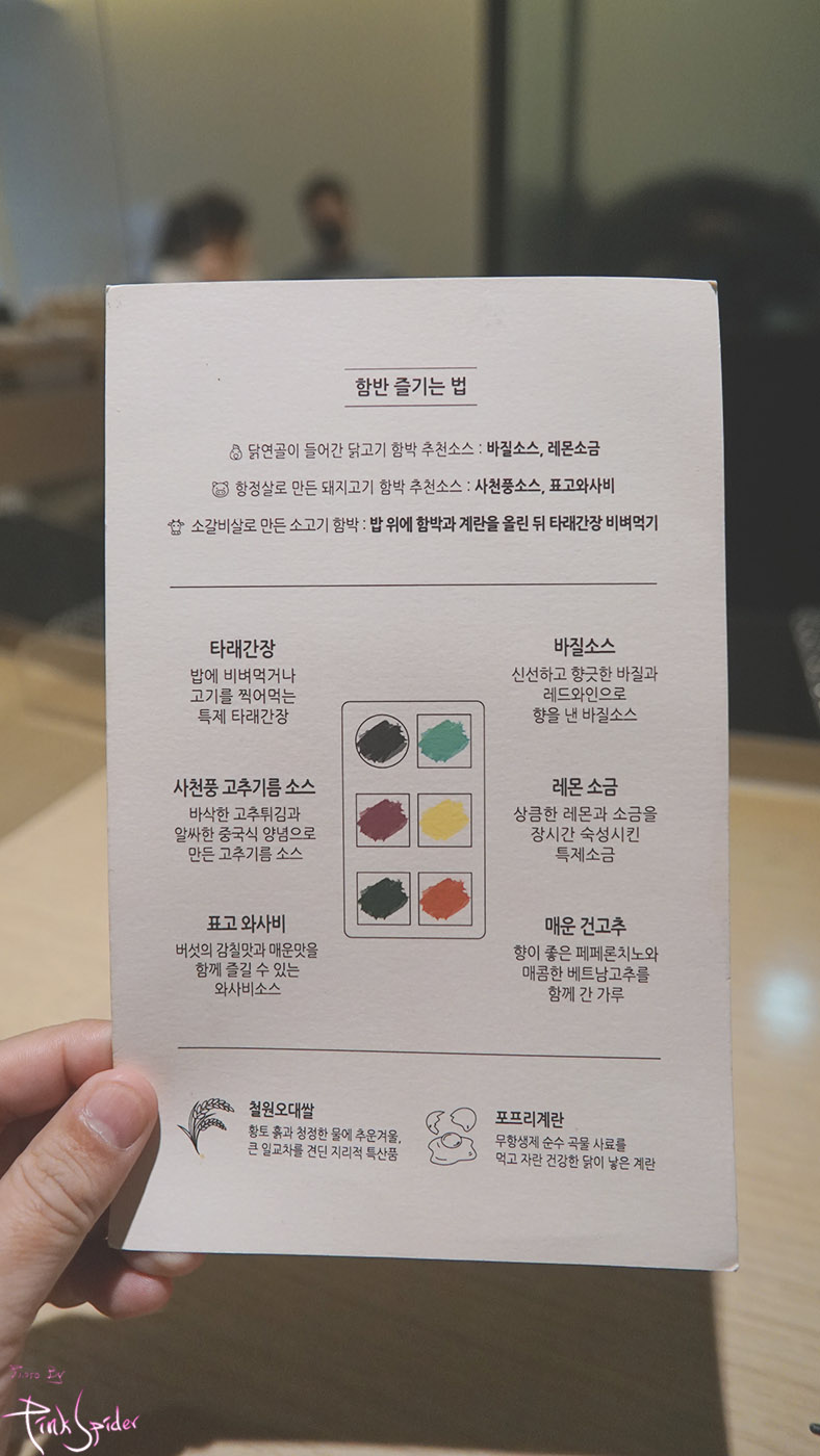 뒷쪽에는 각 고기 종류에 따라서 같이 먹는 소스에 대한 설명이 있다.