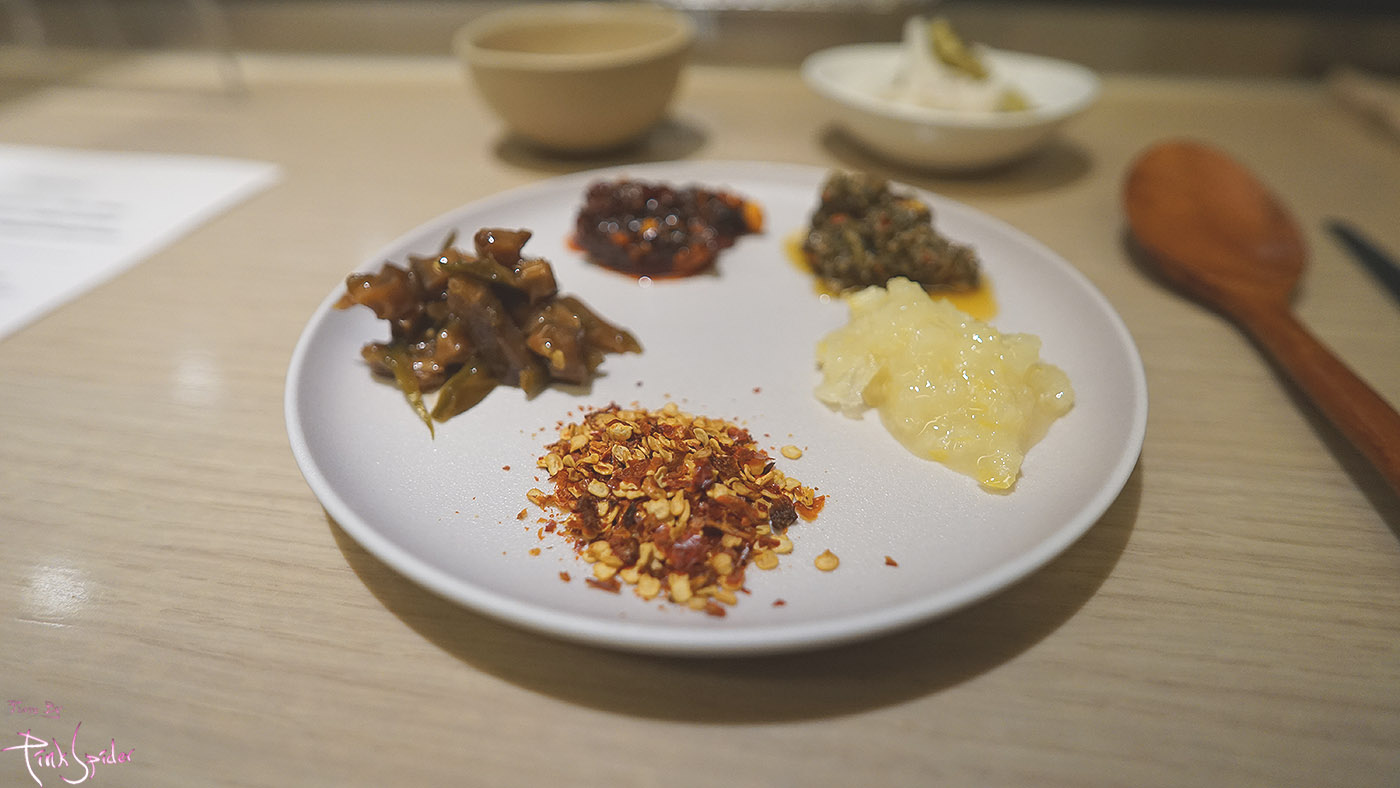 소스는 표고와사비, 사천풍소스, 타레소스, 바질소스, 레몬소금 그리고 매운 건고추 총 6가지