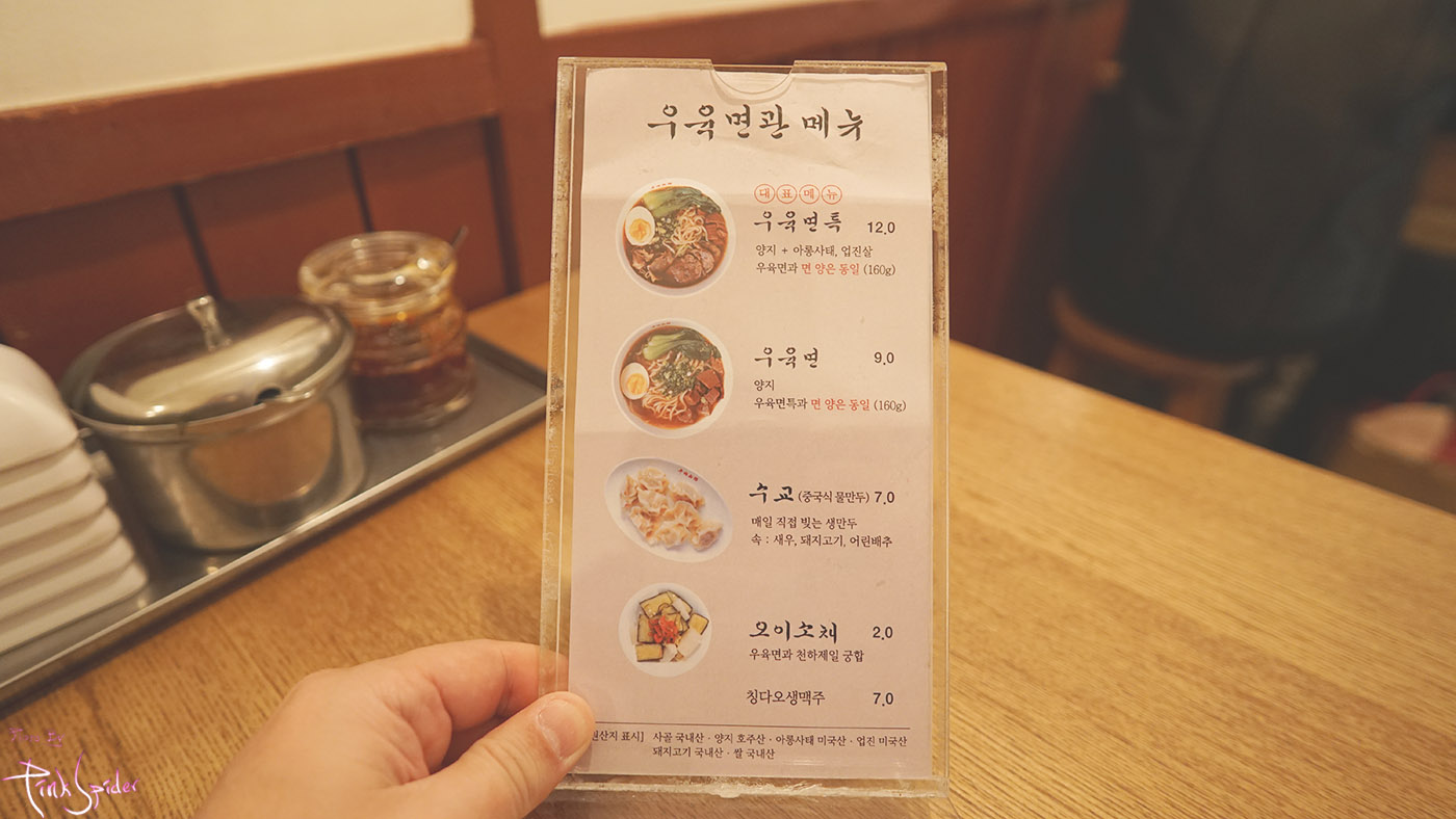 메인 메뉴는 우육면(9,000원)과 양지, 아롱사태 그리고 업진살이 들어간 우육면 특(12,000원)이 있는데
