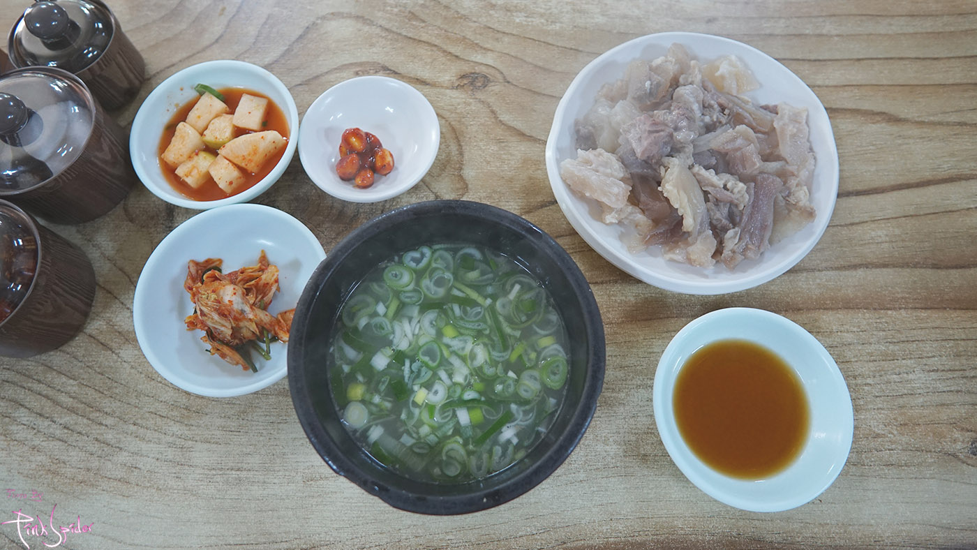 수육을 주문하면 잘게 썰은 대파 듬뿍 들어간 국물과 수육 그리고 반찬들이 나오는데