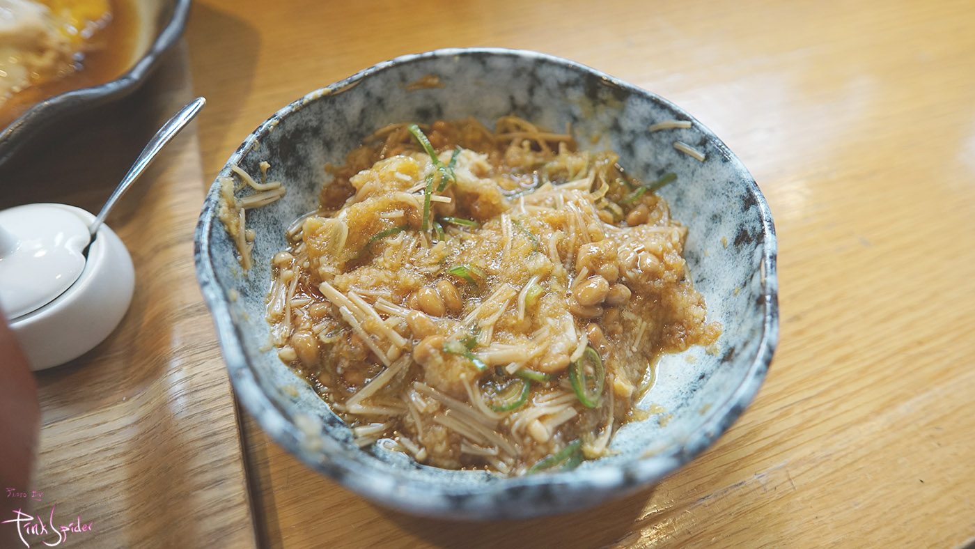 두툼하게 들어간 대파, 간장에 버무려진 팽이버섯, 간 무, 낫또 그리고 날계란 조합이었는데