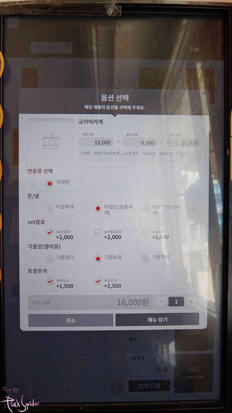 면은 극태면, 염도는 보통, 왠지 맥주는 안 땡겨서 우롱차, 지로계열 라멘의 빠질 수 없는 기름양은 보통
