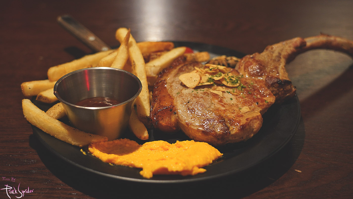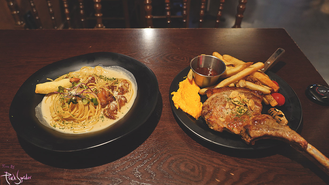 얼마 지나지 않아서 마녀의 돈마호크 스테이크랑 간장치킨 크림파스타 나왔다.