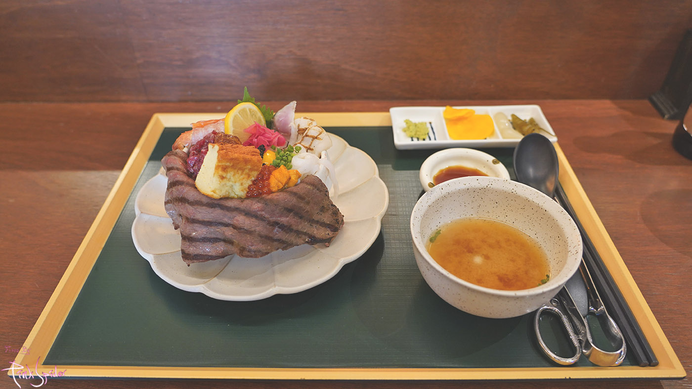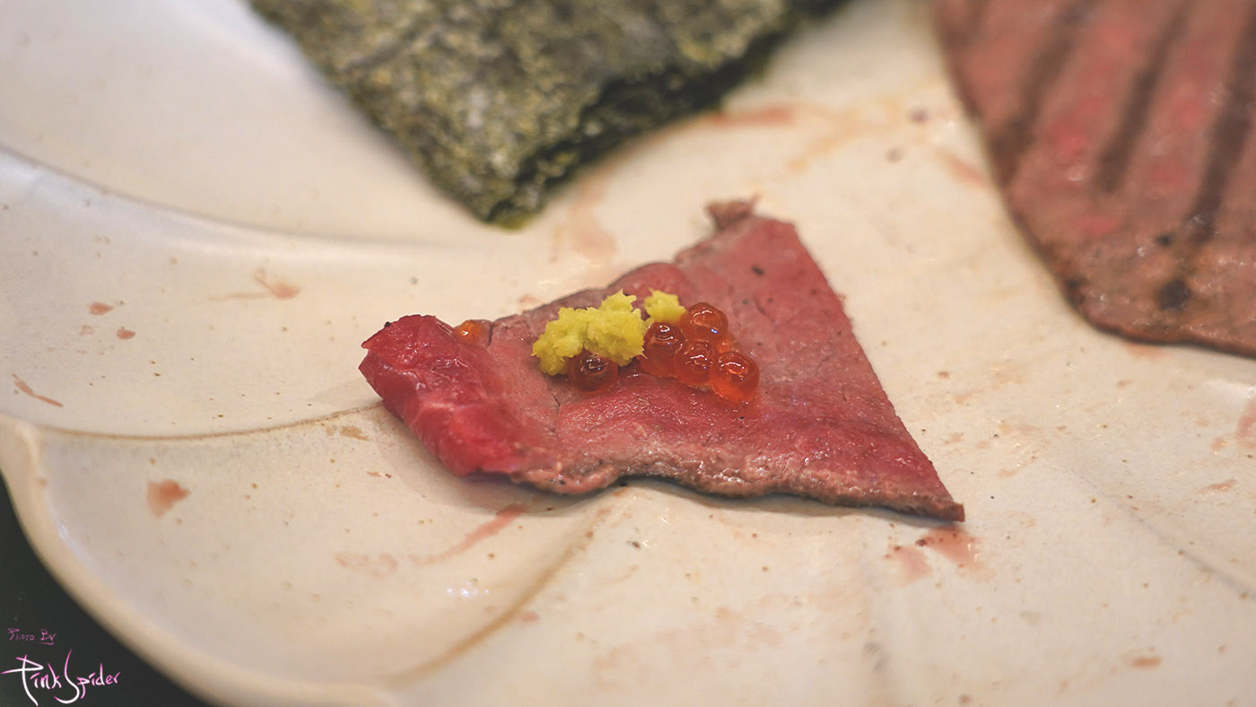 넓직한 투뿔 한우 위에 관자구이, 고등어, 연어회, 연어알, 오징어, 날계란 노른자, 성게알 그리고 교쿠(ギョク) 로 구성~