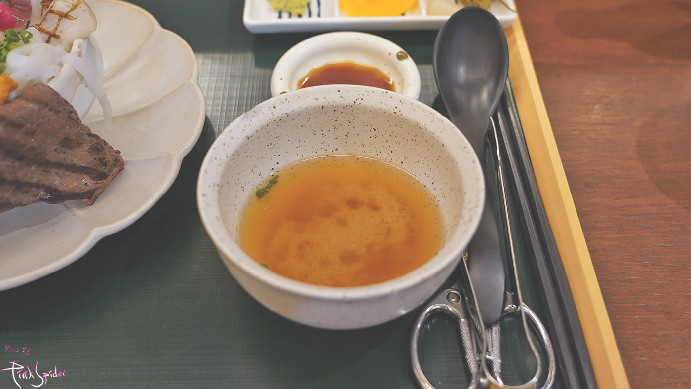 대부분 카이센동 메뉴가 그렇듯이 간단한 반찬, 찍어 먹을 소스 그리고 미소장국이 나온다.