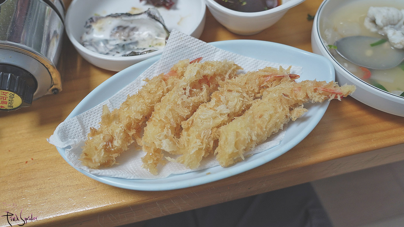 막 바로 교체한 기름에 넣어서 튀긴듯한 황금색 자태의 새우튀김도 좋고