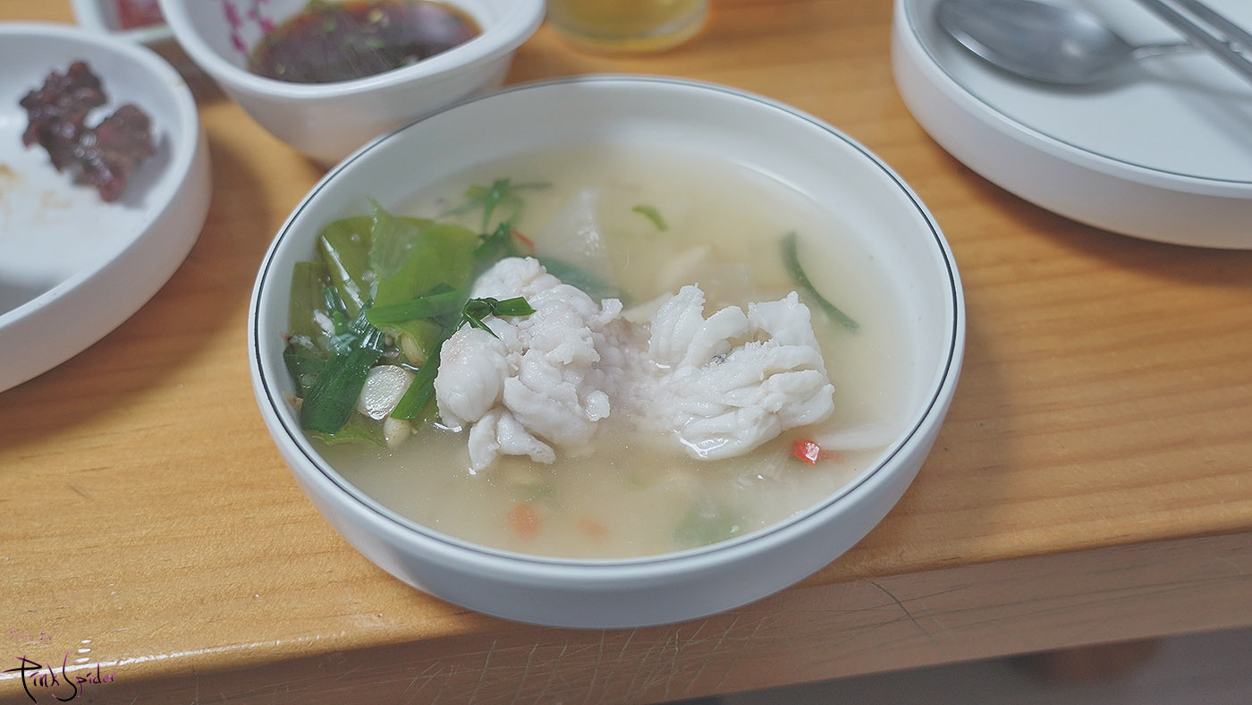 맑은 탕같은 느낌이지만 살짝 칼칼한 맛도 있고 삼이 들어가서 그런지 삼의 맛과 향이 담백한 갯장어와
