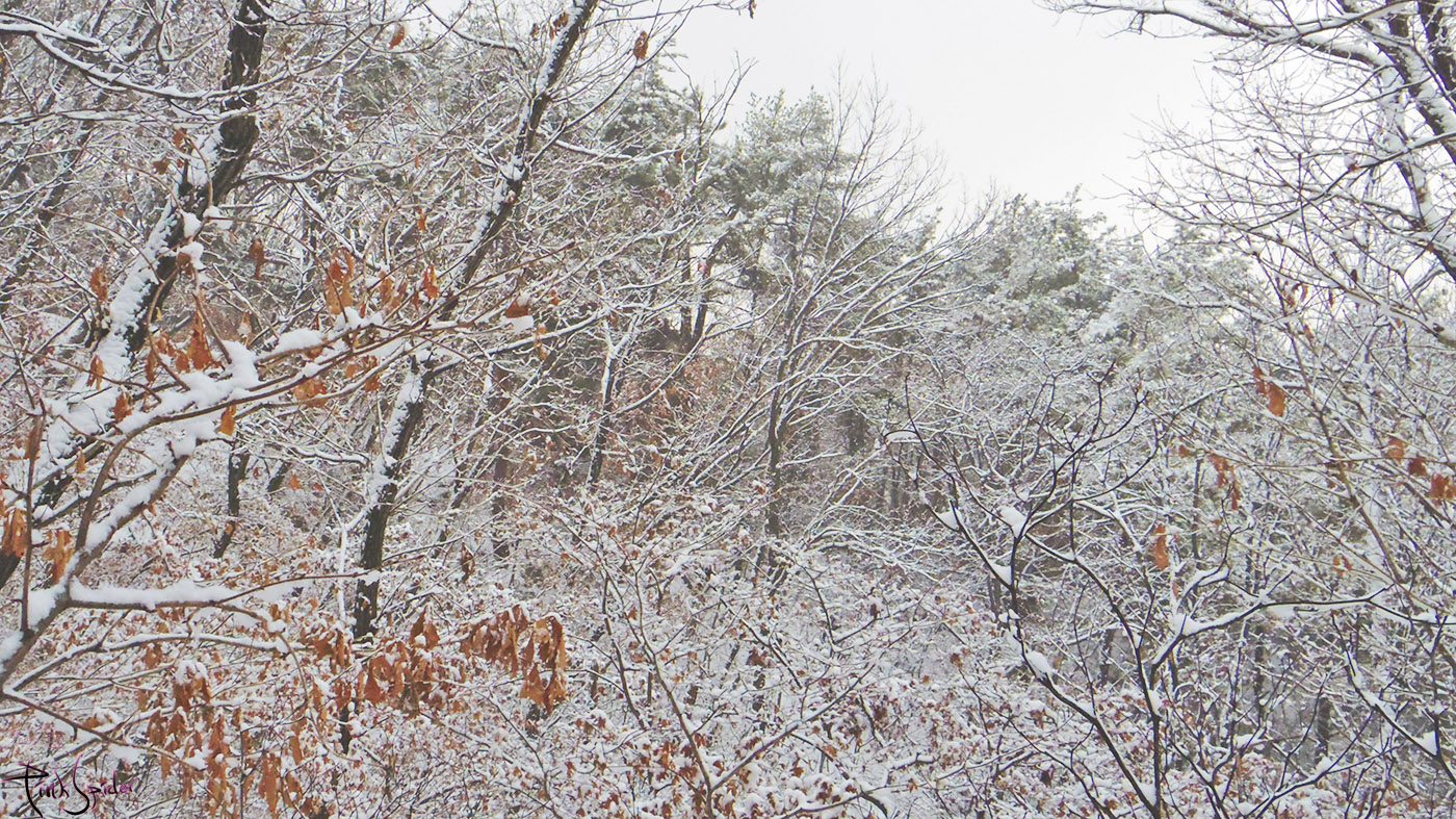 이게 쌓인 눈가 겹쳐지니까 은근히 분위기 좋은 산길로 변하더라.