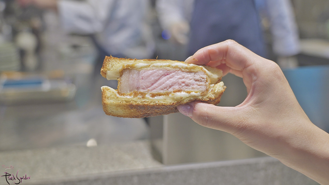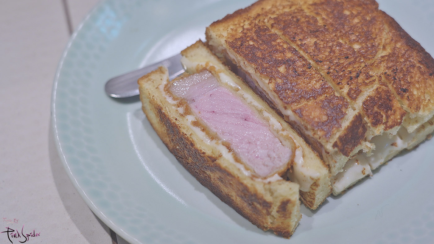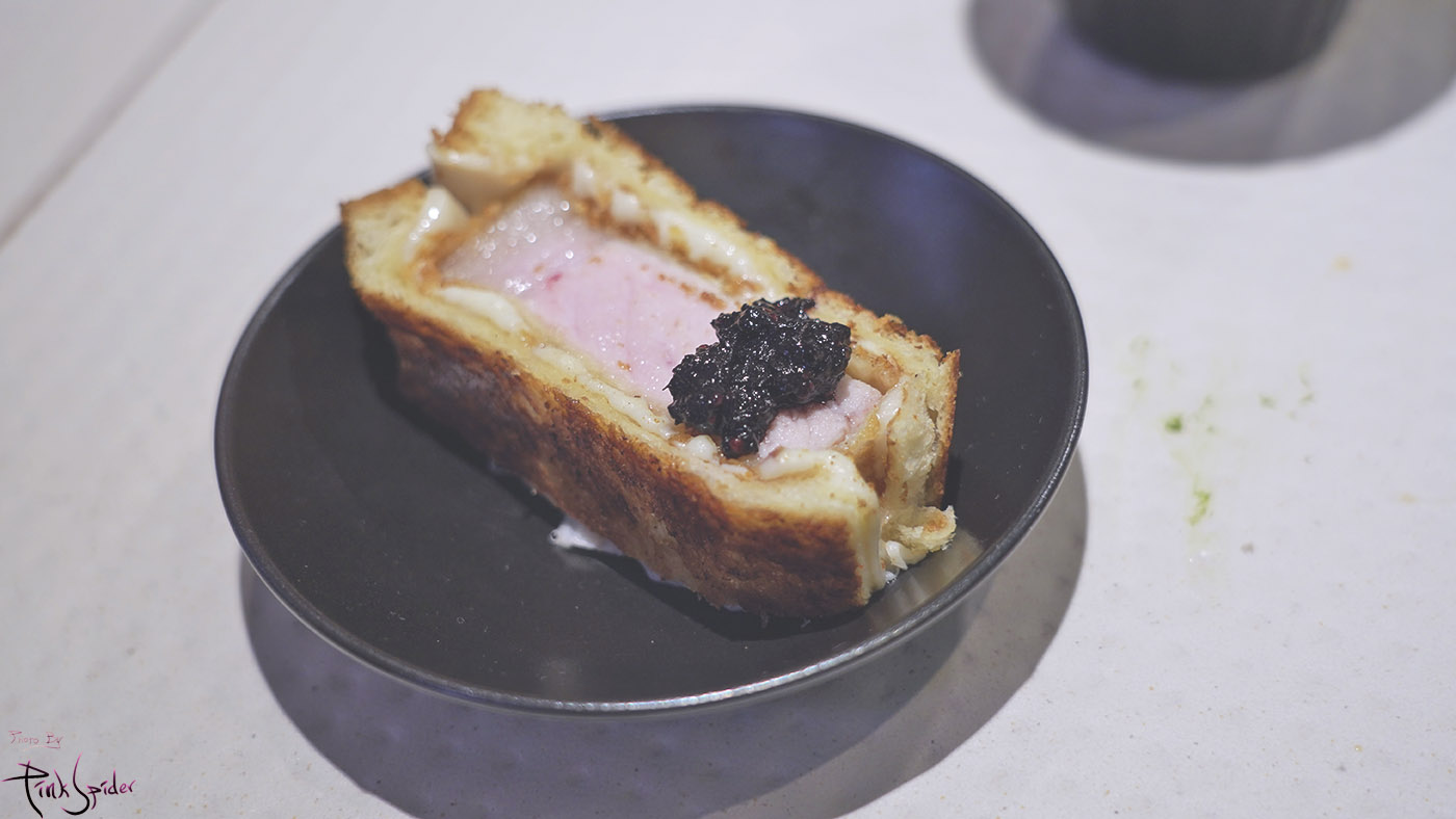 두툼한 등심 돈까스에 치즈를 입힌 토스트 그리고 오디잼과 돈까스 소스가 같이 나옴