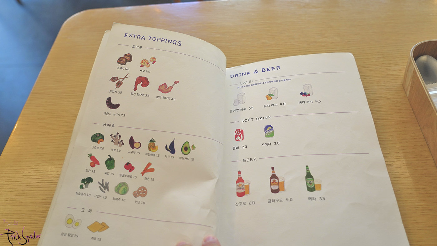 주문은 플레인 라씨, 가쿠니 카레에 후랑크 소세지, 가지 그리고 개인적으로 엄청 좋아하는 영콘 토핑을 추가로 주문했다.