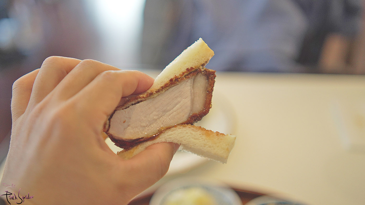 식빵 사이에 튀김옷이 마치 규카츠처럼 두껍지 않고 돈카츠 소스를 적당히 둘러놓은 두툼한 돈카츠는