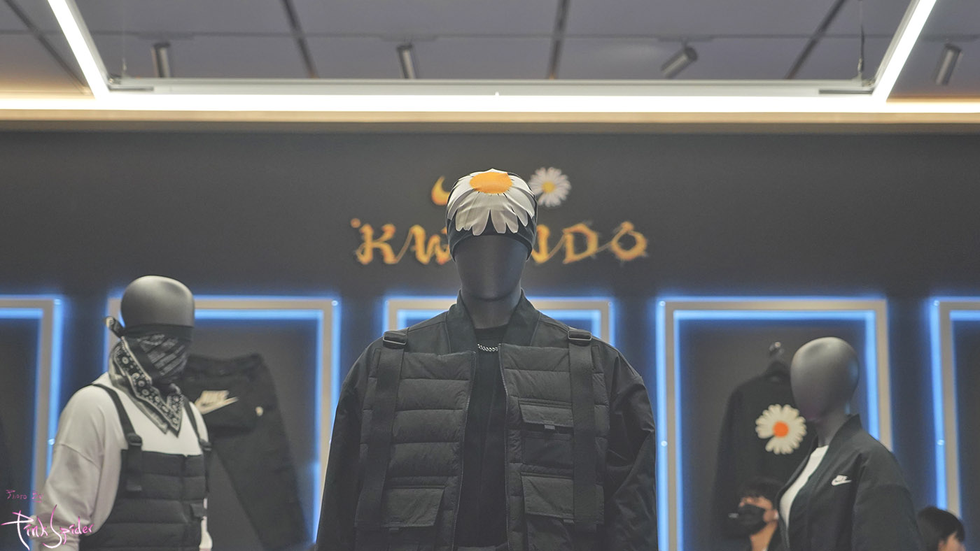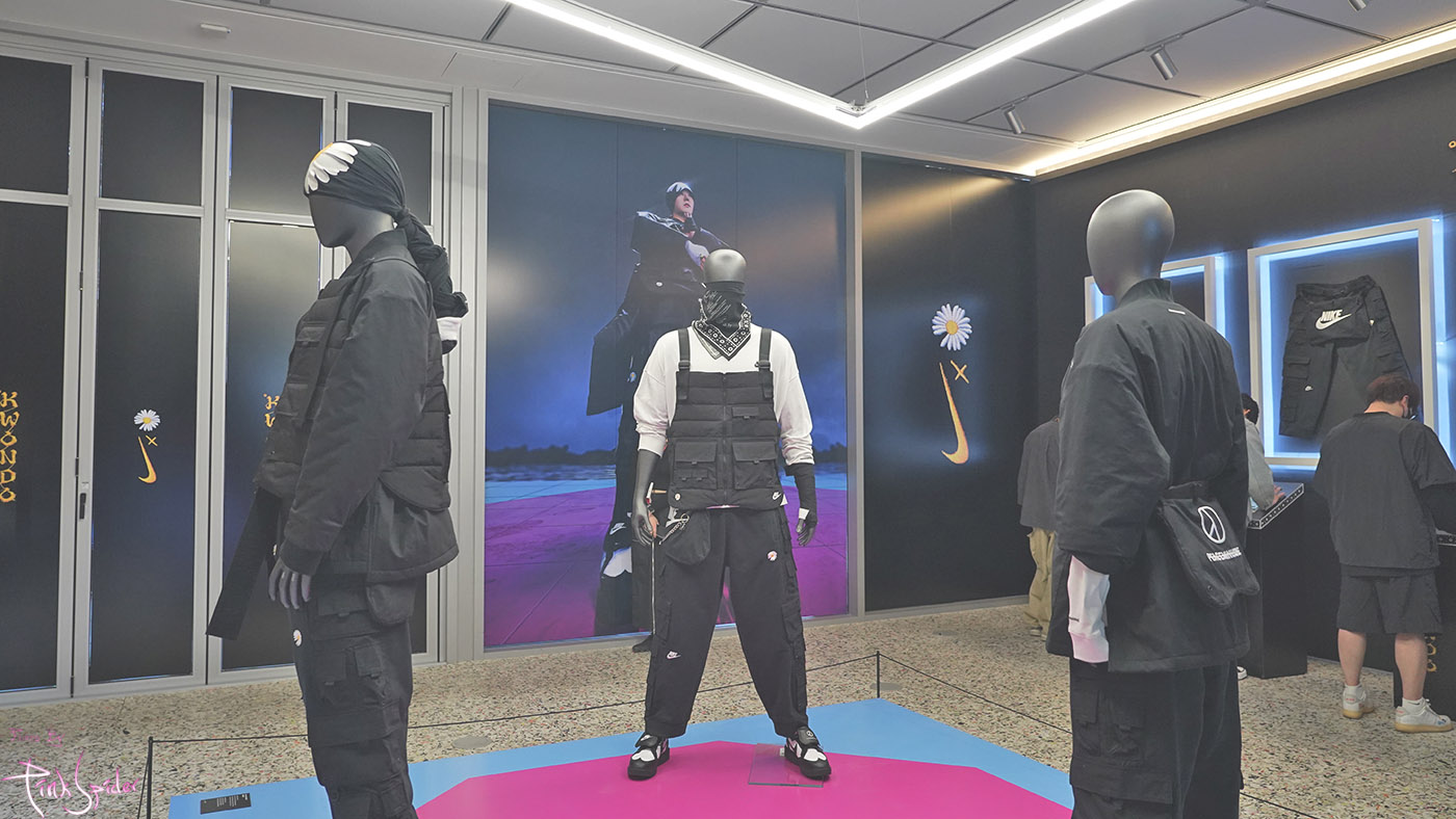 4월 11일에 판매를 하게 될 권도1 블랙&화이트와 의류가 전시되어 있다.