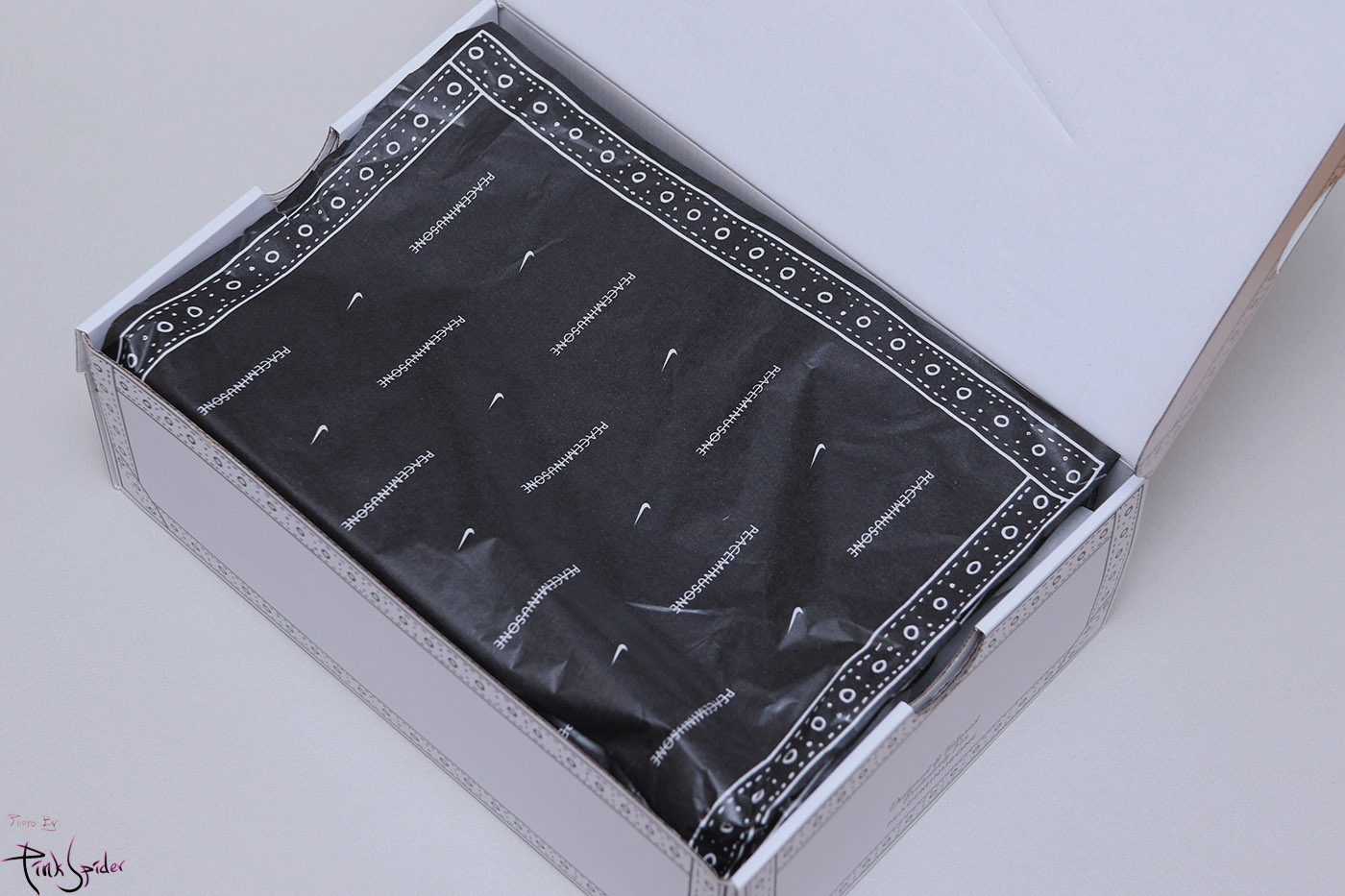 왼쪽 깔창에는 피스마이너스원, 오른쪽에는 나이키로고가 새겨진 패치(라고 해야 하나?)가 있다.
