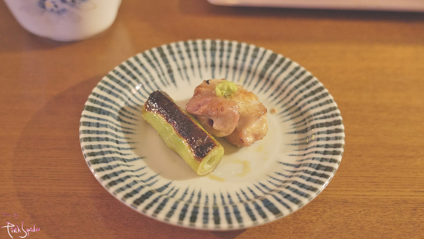 왼쪽부터 말돈 소금을 올린 염통, 대파와 와사비 올린 다리살, 명란이 올라간 살짝 미디엄으로 구운 가슴살