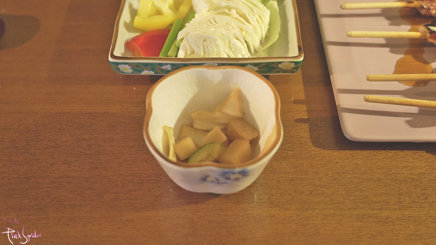 야채와 같이 찍어먹는 오로미소가 나오고 피클같은 양파와 오이가 같이 나온다.