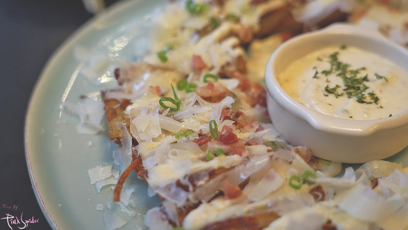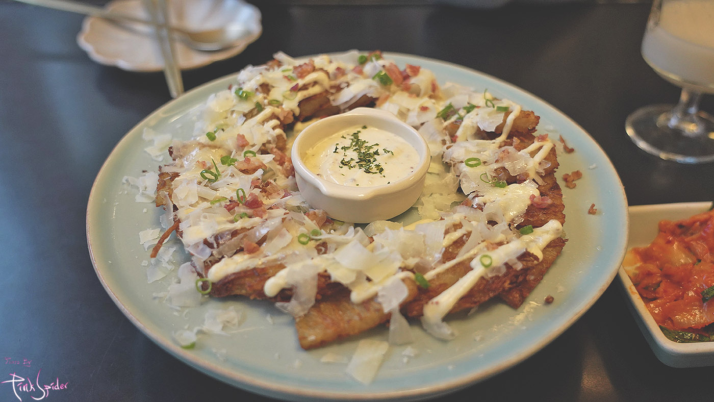 바삭하게 지진 감자전 위에 치즈와 베이컨이 올려진 것 같았는데