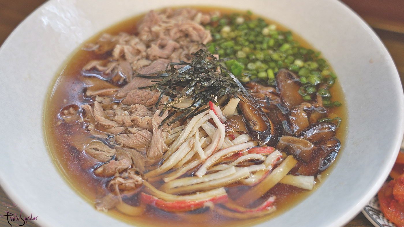 구성은 우동면 위에 게맛살, 소고기, 버섯, 잘게 썰은 파에 김이 올려져 있다.