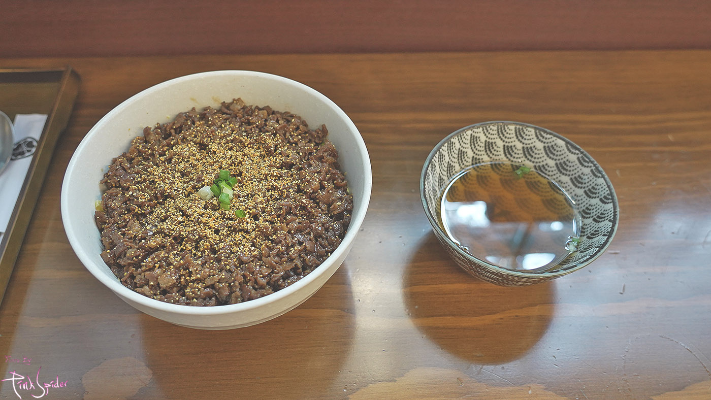 위에는 잘게 다진 소고기 위에 곱게 갈은 깨가 뿌려져 있다.