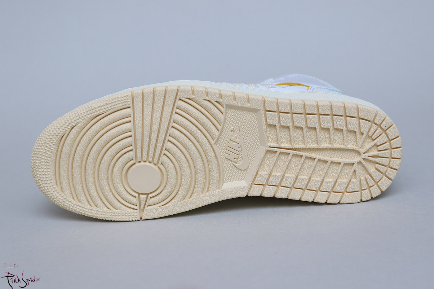 아웃솔 패턴은 기존 조던1과 동일하고 상당히 밝은 톤의 베이지 컬러를 사용했다.