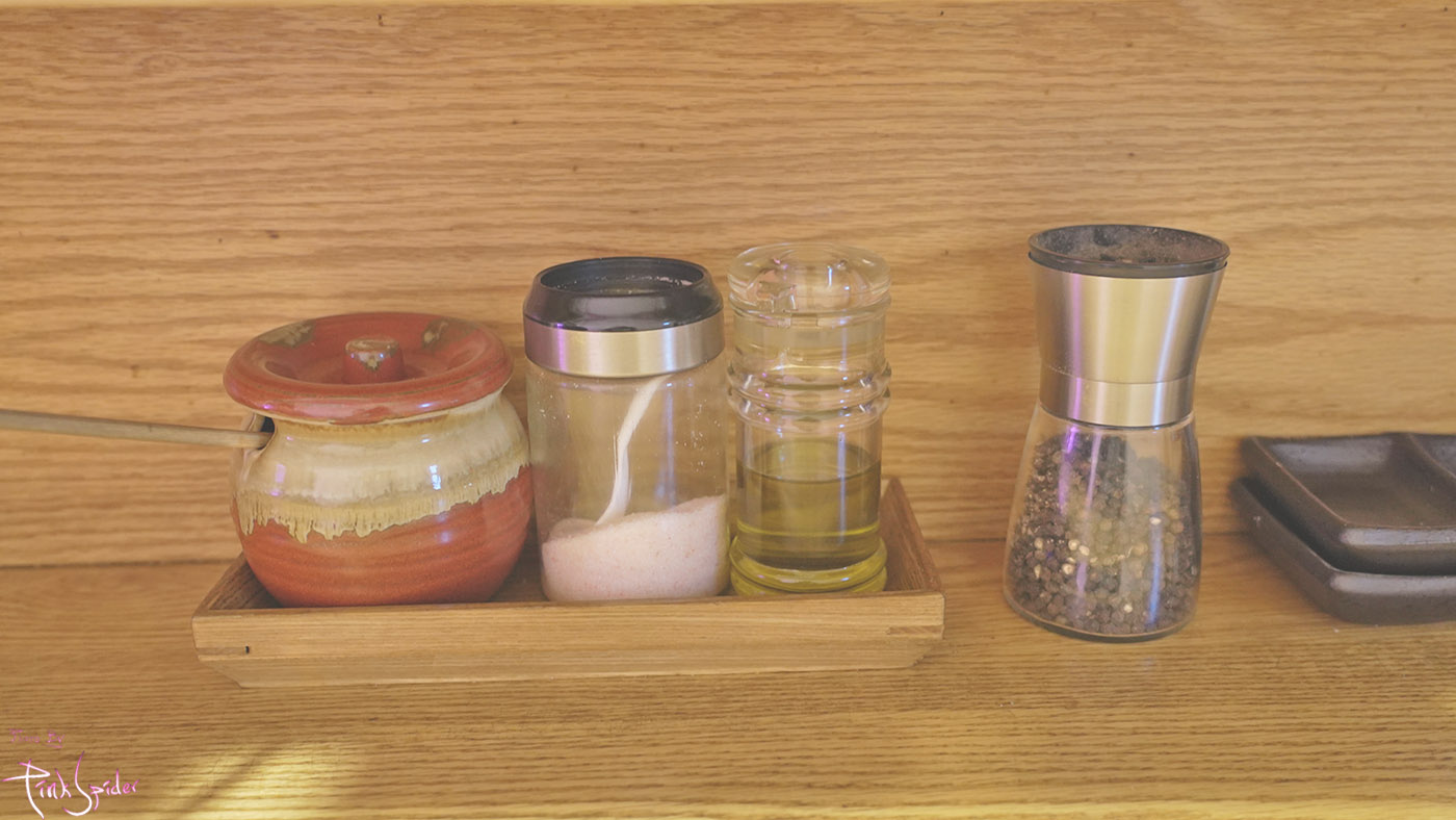 돈카츠와 같이 먹을 돈카츠 소스, 소금(아마도 히말라야 핑크솔트인 것 같음) 그리고 마법의 올리브유