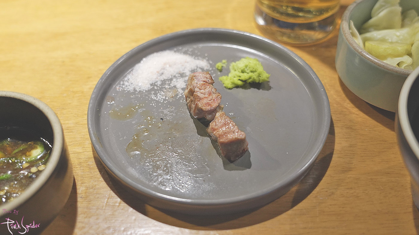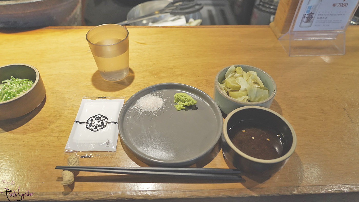 고기를 담을 접시에 소금, 와사비가 있었고 양배추와 오이 피클 그리고 고기를 찍어먹을 소스가 있었음
