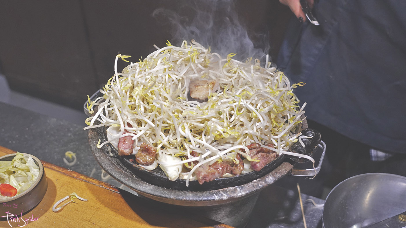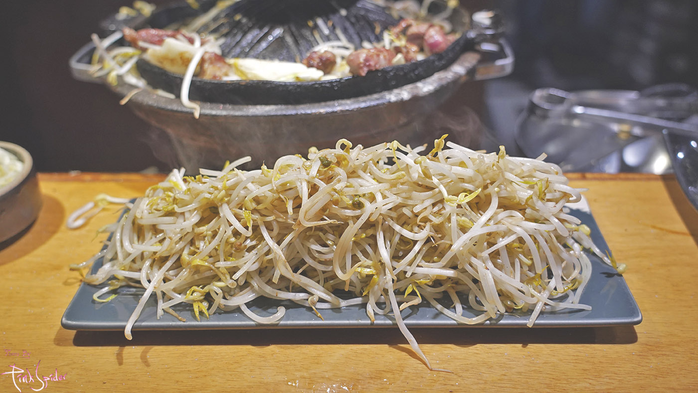양고기를 머금고 있는 철판에 적당히 아삭하게 씹힐 정도로 익혀서 나오는 숙주는