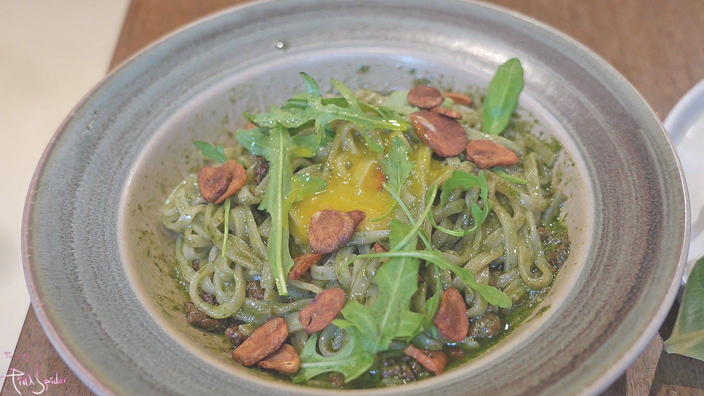 파동의 바질소바는 아주 바삭하게 구운 마늘칩에 계란 노른자까지 들어가니