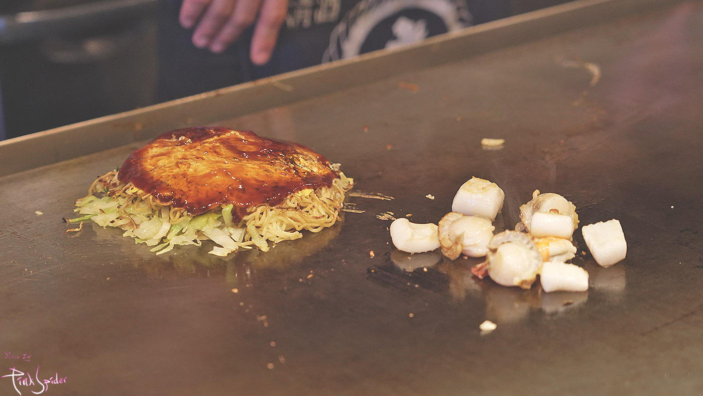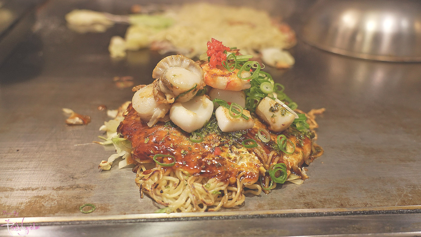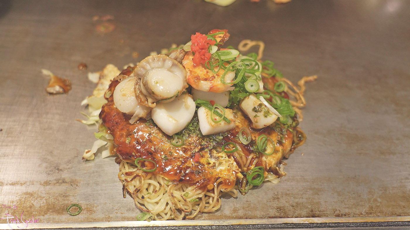 주문은 오징어, 새우 그리고 가리비을 올린 오코노미 야끼로 했고 면은 우동면과 소바면이 있는데