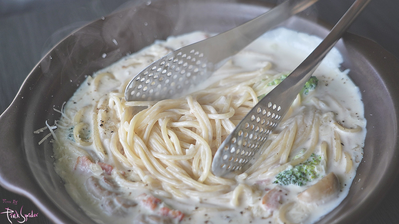 면은 일반적으로 많이 보는 스파게티 면을 사용했고 처음엔 집게로 앞접시에 담아서 먹었는데
