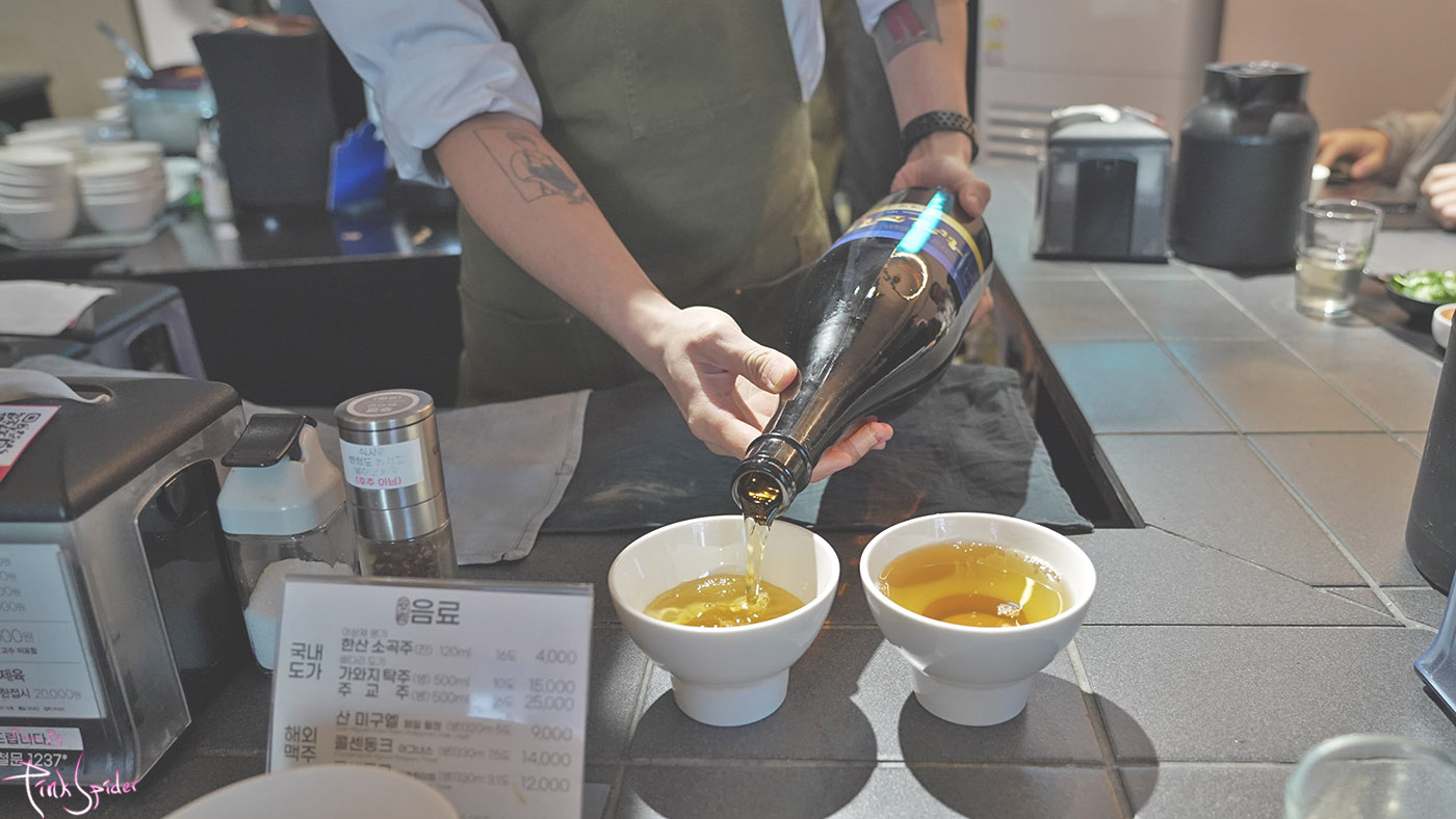 한산 소곡주는 꽤 큰 병에 들어 있는 걸 잔술로 따라 준다.