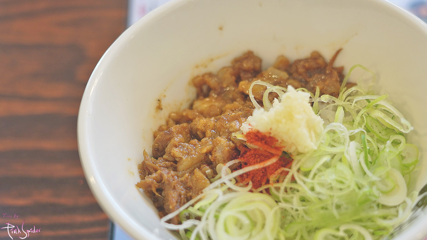 계란 노른자를 중심으로 밑에 민찌 파, 부추, 고등어가루와 간 마늘, 김 그리고 도니꾸(ど肉)가 들어가는데