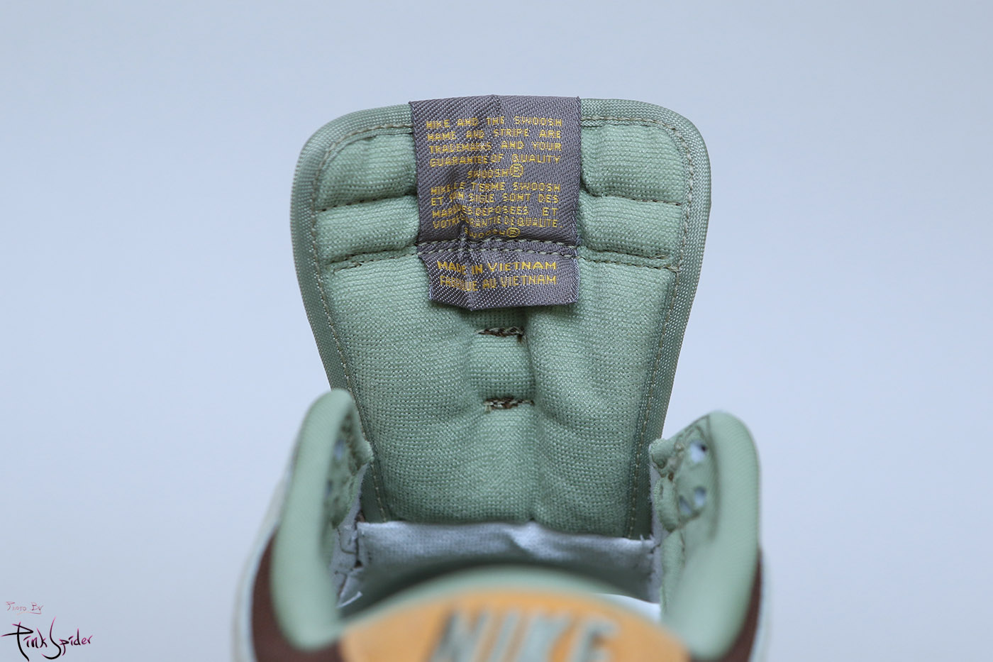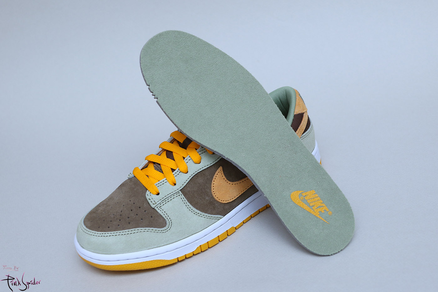 깔창도 더스티 올리브 컬러에 옐로우 컬러로 나이키 로고를 프린팅 해놓음