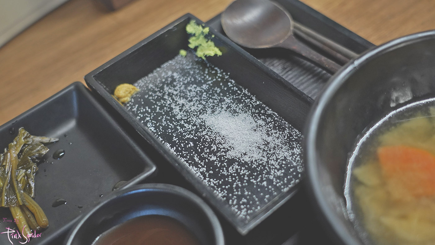 소금을 담은 그릇이 넓직해서 좋고 마치 교토에 유명한 료안지 석정 같은 느낌도 주는 것 같음