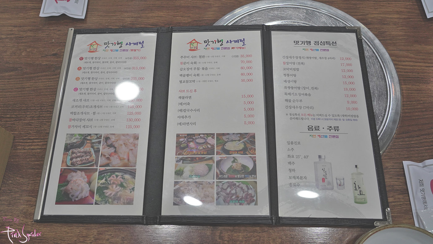 주문은 메뉴판 왼쪽 상단에 있는 A+ 맛기행 한상 (4인분)에 새조개 샤브샤브를 추가했음